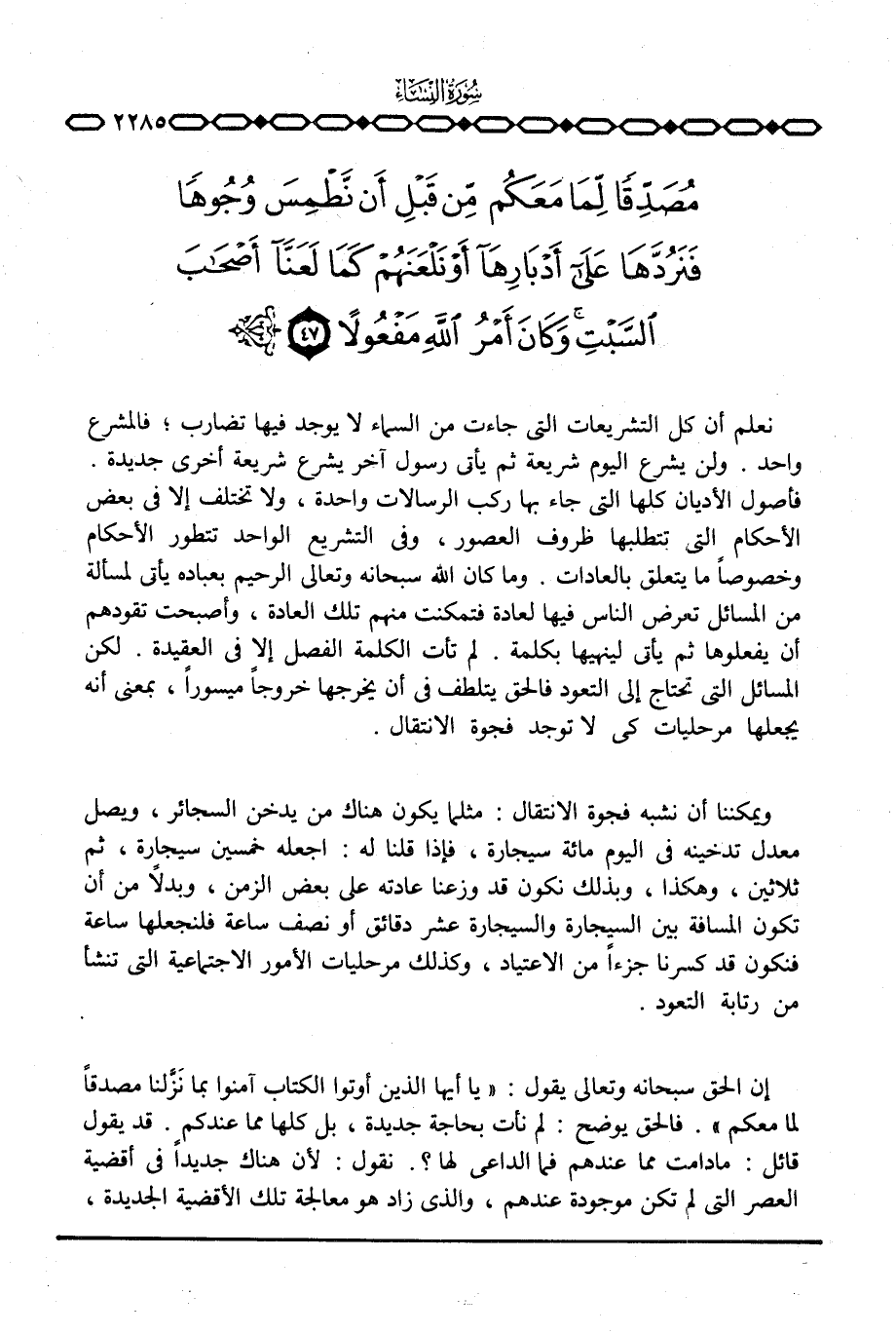 نعلم أن كل التشريعات التي جاءت من السماء لا يوجد فيها تضارب؛ فالمشرع واحد. ولن يشرع اليوم شريعة ثم يأتي رسول آخر يشرع شريعة أخرى جديدة. فأصول الاديان كلها التي جاء بها ركب الرسالات واحدة، ولا تختلف إلا في بعض الأحكام التي تتطلبها ظروف العصور، وفي التشريع الواحد تتطور الأحكام وخصوصاً ما يتعلق بالعادات. وما كان الله سبحانه وتعالى الرحيم بعباده يأتي المسألة من المسائل تعرض الناس فيها لعادة فتمكنت منهم تلك العادة، وأصبحت تقودهم أن يفعلوها ثم يأتي لينهيها بكلمة. لم تأت الكلمة الفصل إلا في العقيدة. لكن المسائل التي تحتاج لينهيها بكلمة. لم تأت الكلمة الفصل إلا في العقيدة. لكن المسائل التي تحتاج إلى التعود فالحق يتلطف في أن يخرجها خروجاً ميسوراً، بمعنى أنه يجعلها مرحليات كي لا توجد فجوة الانتقال.