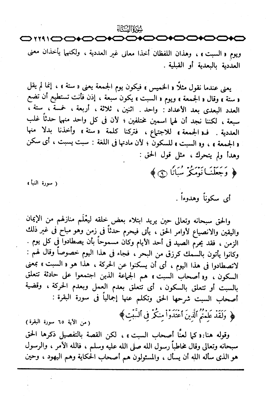 والحق سبحانه وتعالى حين يريد ابتلاء بعض خلقه ليعْلَم منازلهم منازلهم من الإيمان واليقين والانصياع لأوامر الحق، يأتي فيحرم حدثاً في زمن وهو مباح في غير ذلك الزمن، فقد يحرم الصيد في أحد الأيام وكان مسموحاً بأن يصطادوا في كل يوم. وكانوا يأتون بالسمك كرزق من البحر، فجاء في هذا اليوم خصوصاً وقال لهم: لا تصطادوا في هذا اليوم، أي أن يسكنوا عن الحركة، هذا هو «السبت» بمعنى السكون، و «أصحاب السبت» هم الجماعة الذين اجتمعوا على حادثة تتعلق بالسبت أو تتعلق بالسكون، أي تتعلق بعدم العمل وبعدم الحركة، وقضية أصحاب السبت شرحها الحق وتكلم عنها إجمالياً في سورة البقرة: {وَلَقَدْ عَلِمْتُمُ الذين اعتدوا مِنْكُمْ فِي السبت} [البقرة: 65] .