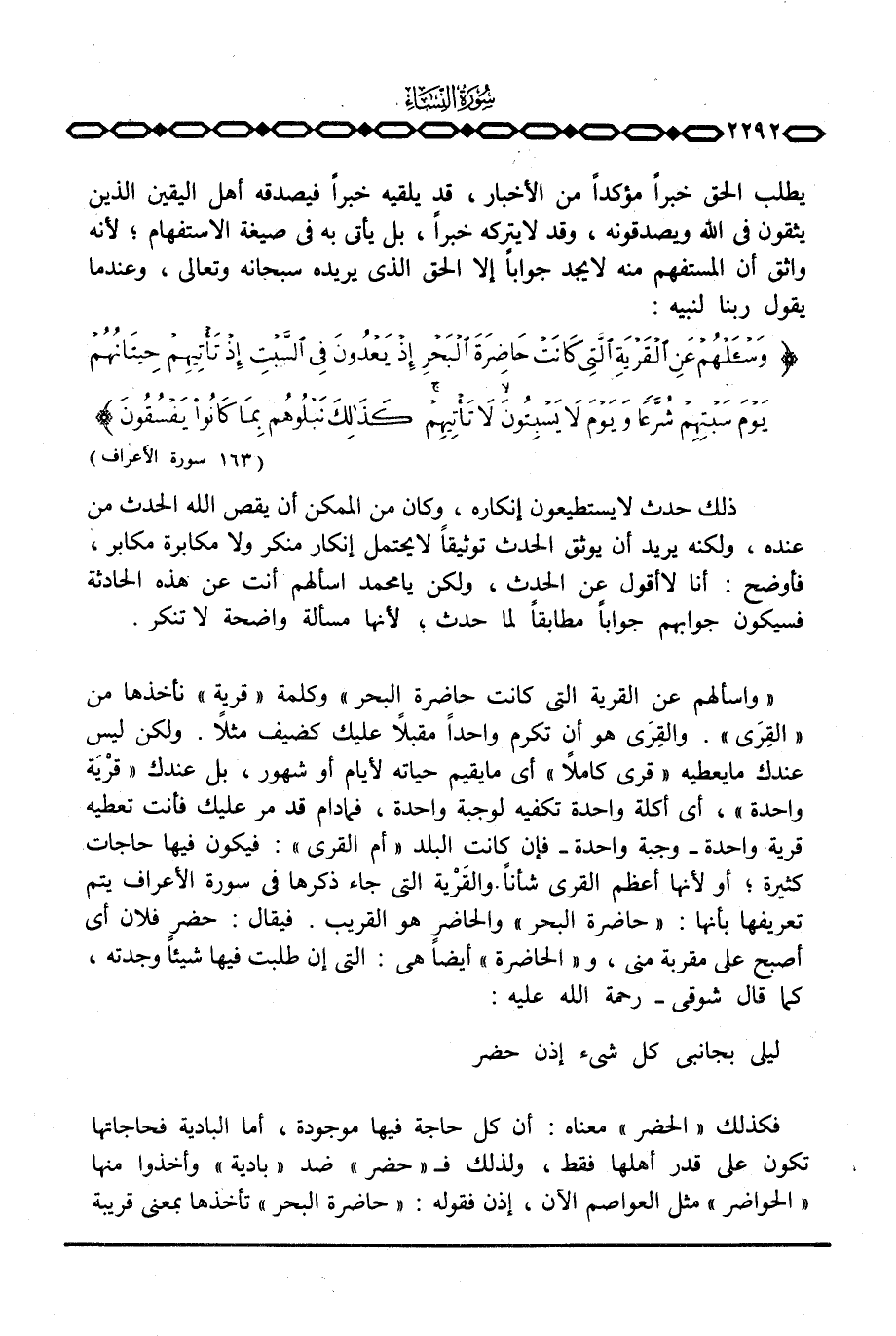 {وَسْئَلْهُمْ عَنِ القرية التي كَانَتْ حَاضِرَةَ البحر} . والقِرَى هو أن تكرم واحداً مقبلاً عليك كضيف مثلاً. ولكن ليس عندك ما يعطيه «قرى كاملاً» أي ما يقيم حياته لأيام أو شهور، بل عندك «قَرْيَة واحدة» أي أكلة واحدة تكفيه لوجبة واحدة، فما دام قد مر عليك فأنت تعطيه قرية واحدة - وجبة واحدة - فإن كانت البلد «أم القرى» : فيكون فيها حاجات كثيرة؛ أو لأنها أعظم القرى شأناً والقَرْية التي جاء ذكرها في سورة الأعراف يتم تعريفها بأنها: «حاضرة البحر» والحاضر هو القريب. فيقال: حضر فلان أي أصبح على مقربة مني، و «الحاضرة» أيضاً هي: التي إن طلبت فيها شيئاً وجدته، كما قال شوقي - رحمة الله عليه: