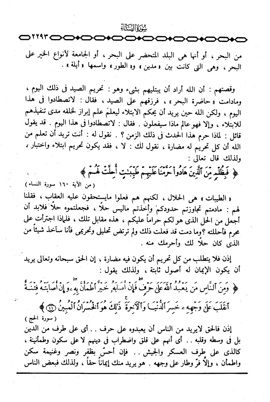 «الطيبات» هي الحلال، لكنهم هم فعلوا ما يستحقون عليه العقاب، فقلنا لهم: ما دمتم تجاوزتم حدودكم وأخذتم ما ليس حلاً، فجعلتموه حلاً فلا بد أن أجعل من الحل الذي هو لكم حراماً عليكم، هذه مقابل تلك، فلماذا اجترأت على محرم فأحللته؟ وما دمت قد فعلت ذلك ولم ترتض تحليلي وتحريمي فأنا سآخذ شيئاً من الذي كان حلاً لك وأحرمك منه.