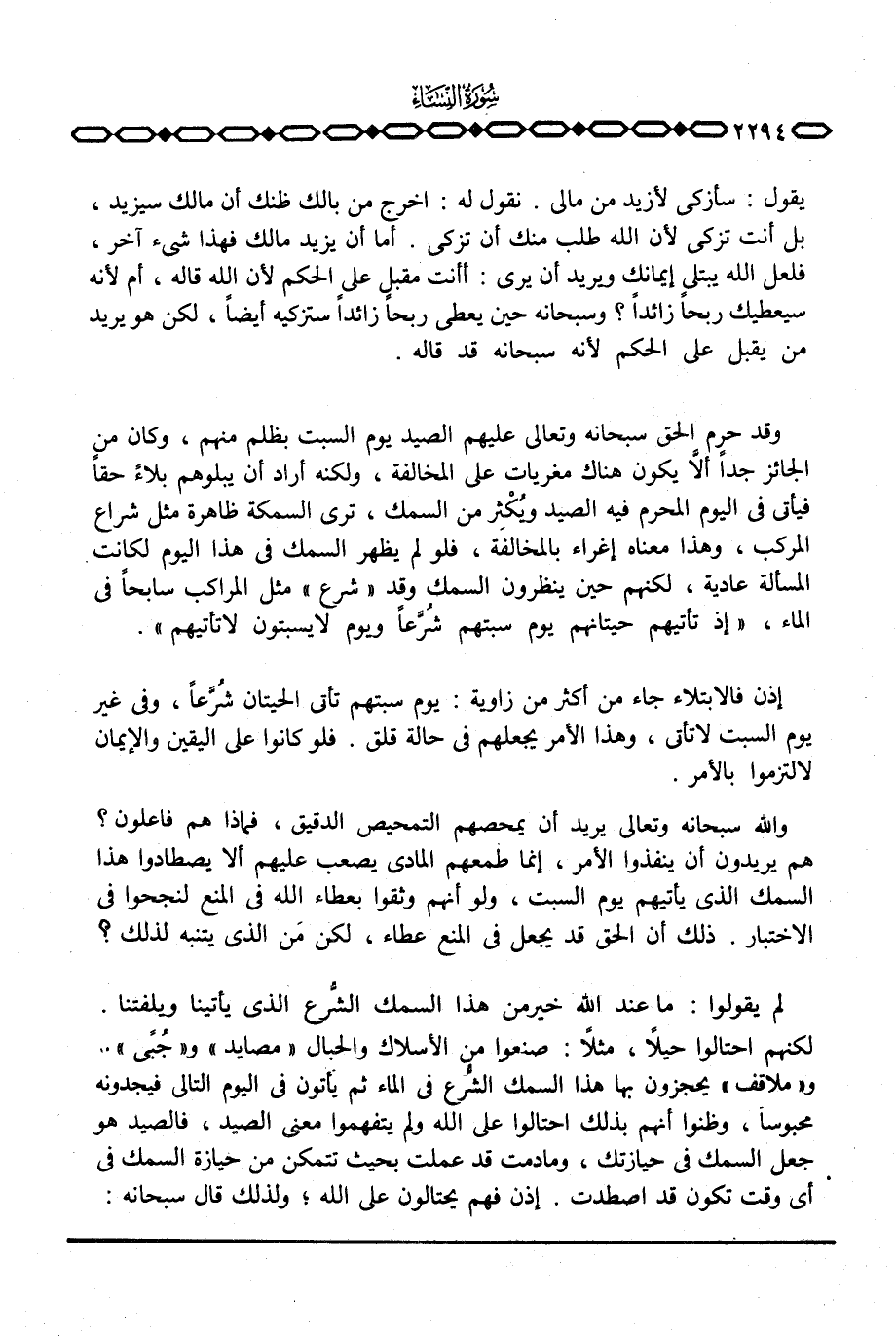 لم يقولوا: ما عند الله خير من هذا السمك الشُّرع الذي يأتينا ويلفتنا. لكنهم احتالوا حيلاً، مثلاً: صنعوا من الإسلاك والحبال «مصايد» و «جُبًى» . و «ملاقف» يحجزون بها هذا السمك الشُّرع في الماء ثم يأتون في اليوم التالي فيجدونه محبوساً، وظنوا أنهم بذلك احتالوا على الله ولم يتفهموا معنى الصيد، فالصيد هو جعل السمك في حيازتك، وما دمت قد عملت بحيث تتمكن من حيازة السمك في أي وقت تكون قد اصطدت.