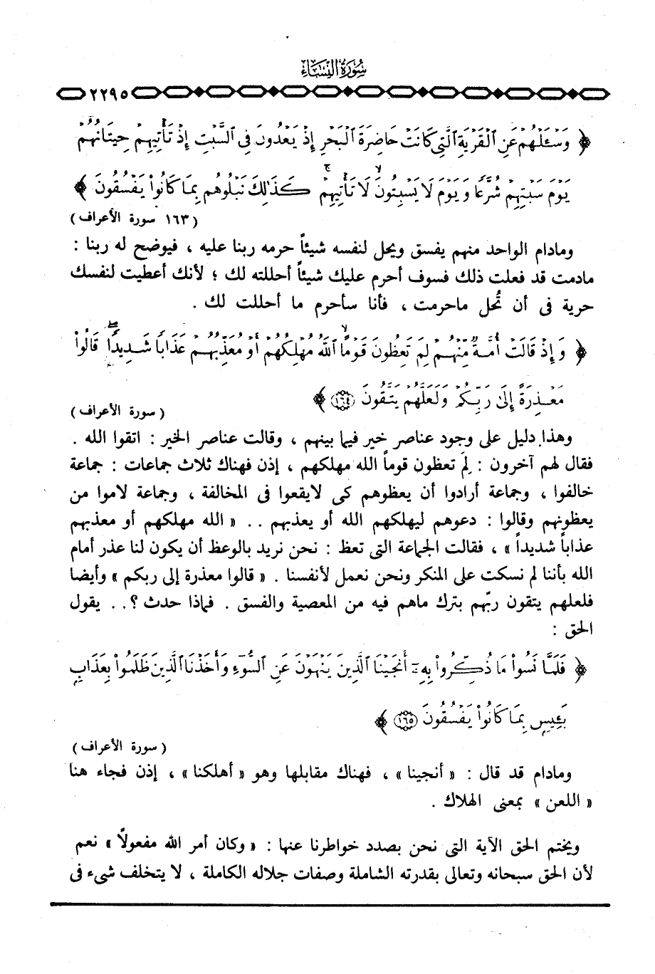 وهذا دليل على وجود عناصر خير فيما بينهم، وقالت عناصر الخير: اتقوا الله. فقال لهم آخرون: لِمَ تعظون قوماً لله مهلكهم، إذن فهناك ثلاث جماعات: جماعة خالفوا، وجماعة أرادوا أن يعظوهم كي لا يقعوا في المخالفة، وجماعة لاموا من يعظونهم وقالوا: دعوهم ليهلكهم الله أو يعذبهم. . «الله مهلهكم أو معذبهم عذاباً شديداً» ، فقالت الجماعة التي تعظ: نحن نريد بالوعظ أن يكون لنا عذر أمام الله بأننا لم نسكت على المنكر ونحن نعمل لأنفسنا. «قالوا معذرة إلى ربكم» وأيضا فلعلهم يتقون ربّهم بترك ماهم فيه من المعصية والفسق. فماذا حدث؟ . . يقول الحق: {فَلَماَّ نَسُواْ مَا ذُكِّرُواْ بِهِ أَنجَيْنَا الذين يَنْهَوْنَ عَنِ السواء وَأَخَذْنَا الذين ظَلَمُواْ بِعَذَابٍ بَئِيسٍ بِمَا كَانُواْ يَفْسُقُونَ} [الأعراف: 165] .