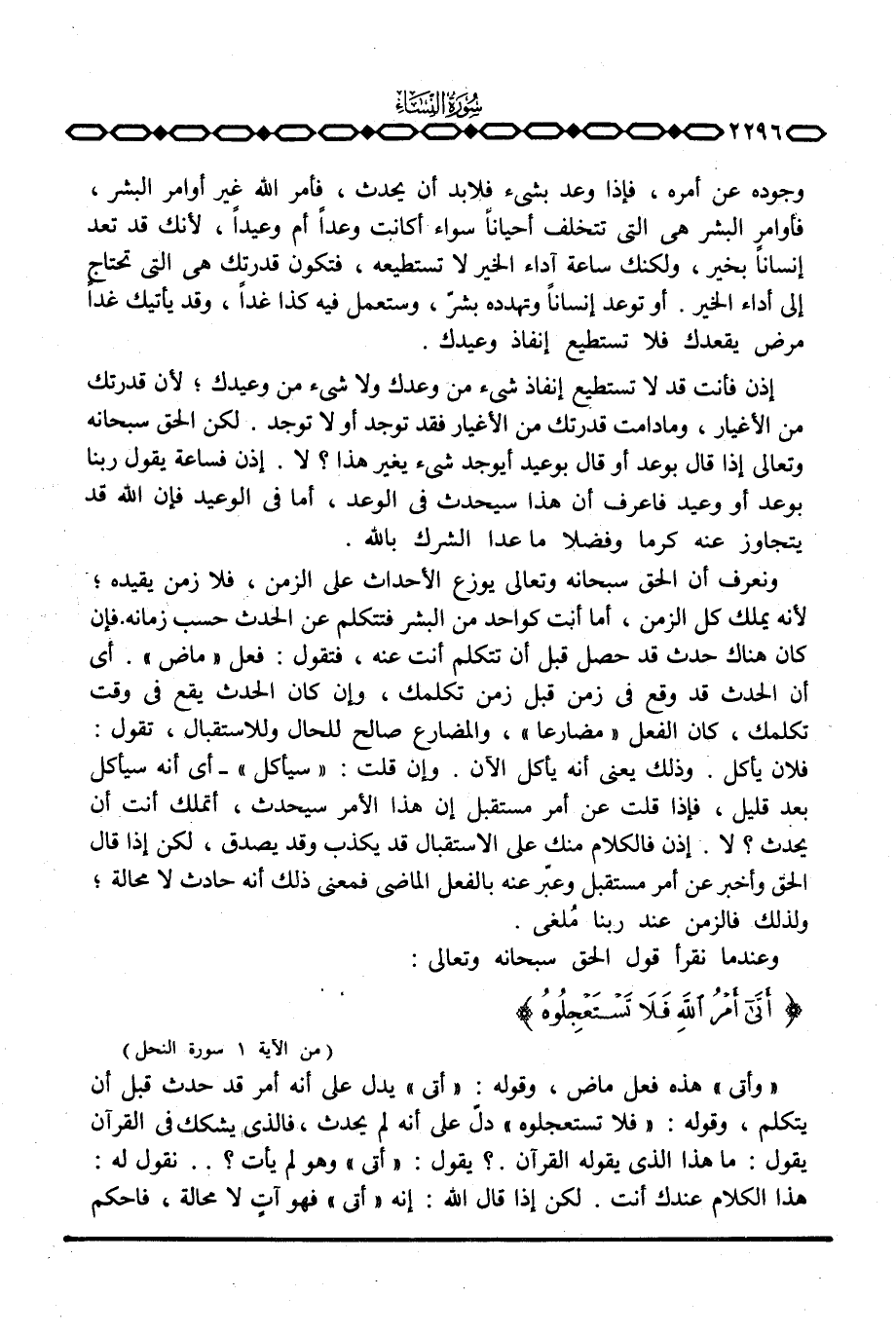 «وأتى» هذه فعل ماض، وقوله: «أتى» يدل على أنه أمر قد حدث قبل أن يتكلم، وقوله: {فَلاَ تَسْتَعْجِلُوهُ} دلّ على أنه لم يحدث، فالذي يشكك في القرآن يقول: ما هذا الذي يقوله القرآن.؟ يقول: «أتى» وهو لم يأت؟ . . نقول له: هذا الكلام عندك أنت. لكن إذا قال الله: إنه «أتى» فهو آتٍ لا محالة، فاحكم