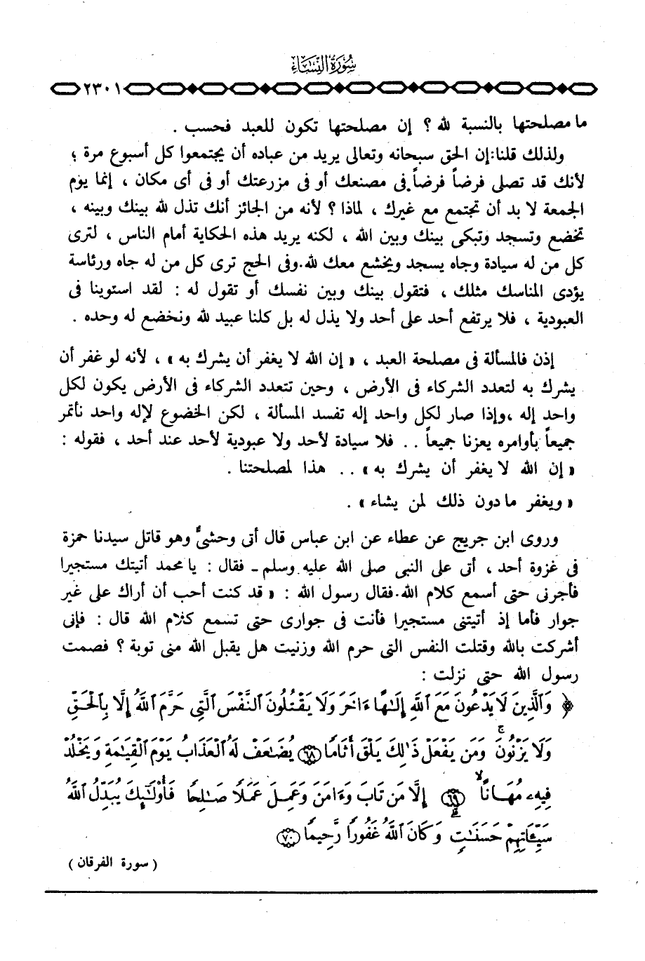 إذن فالمسألة في مصلحة العبد، {إِنَّ الله لاَ يَغْفِرُ أَن يُشْرَكَ بِهِ} ، لأنه لو غفر أن يشرك به لتعدد الشركاء في الأرض، وحين تعدد الشركاء في الأرض يكون لكل واحد إله، وإذا صار لكل واحد إله تفسد المسألة، لكن الخضوع لإله واحد نأتمر جميعاً بأوامره يعزنا جميعا. . فلا سيادة لأحد ولا عبودية لأحد عند أحد، فقوله: {إِنَّ الله لاَ يَغْفِرُ أَن يُشْرَكَ بِهِ} . . هذا لمصلحتنا.