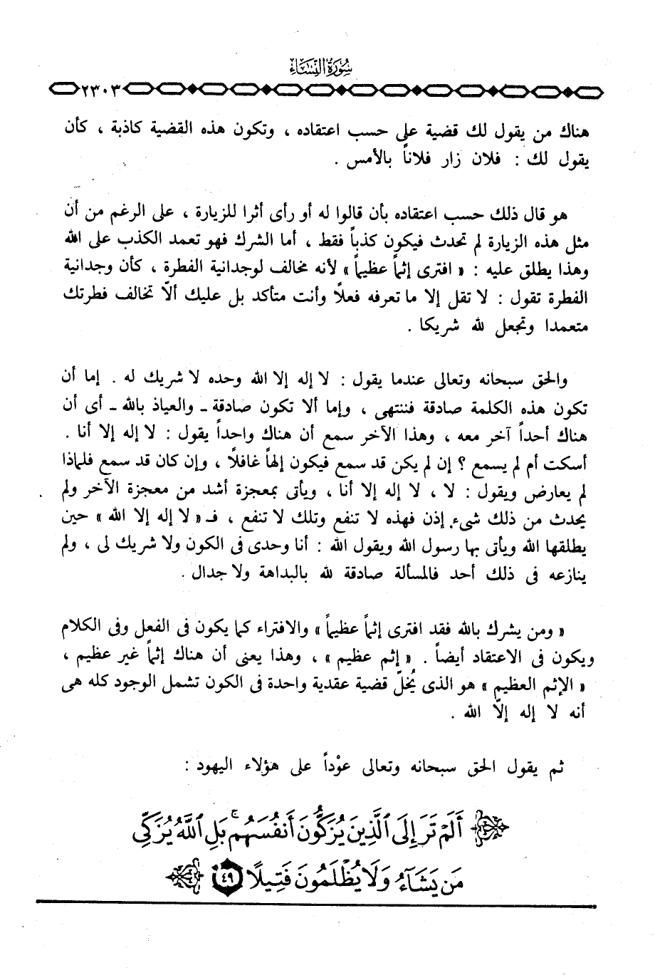 {وَمَن يُشْرِكْ بالله فَقَدِ افترى إِثْماً عَظِيماً} والافتراء كما يكون في الفعل وفي الكلام ويكون في الاعتقاد أيضاً. «إثم عظيم» ، وهذا يعني أن هناك إثما غير عظيم، «الإثم العظيم» هو الذي يُخلّ قضية عقدية واحدة في الكون تشمل الوجود كله هي أنه لا إله إلا الله.