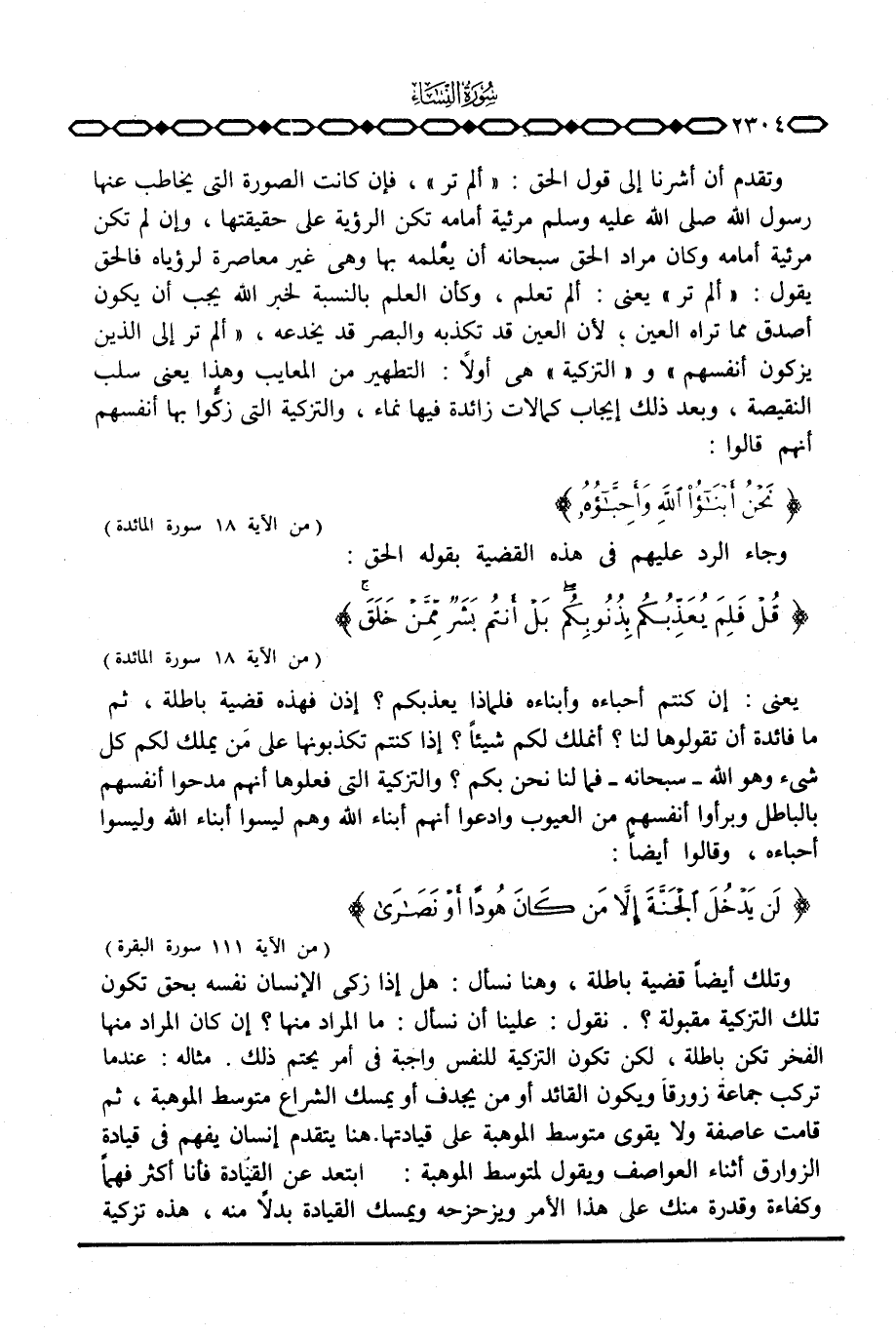 وتقدم أن أشرنا إلى قول الحق: «ألم تر» ، فإن كانت الصورة التي يخاطب عنها رسول الله صَلَّى اللَّهُ عَلَيْهِ وَسَلَّم َ مرئية أمامه تكن الرؤية على حقيقتها، وإن لم تكن مرئية أمامه وكان مراد الحق سبحانه أن يعْلمه بها وهي غير معاصرة لرؤياه فالحق يقول: «أَلَمَ تَرَ» يعني: ألم تعلم، وكأن العلم بالنسبة لخبر الله يجب أن يكون أصدق مما تراه العين؛ لأن العين قد تكذبه والبصر قد يخدعه، {أَلَمْ تَرَ إِلَى الذين يُزَكُّونَ أَنْفُسَهُمْ} و «التزكية» هي أولاً: التطهير من المعايب وهذا يعني سلب النقيصة، وبعد ذلك إيجاب كمالات زائدة فيها نماء، والتزكية التي زكُّوا بها أنفسهم أنهم قالوا: {نَحْنُ أَبْنَاءُ الله وَأَحِبَّاؤُهُ} [المائدة: 18] .