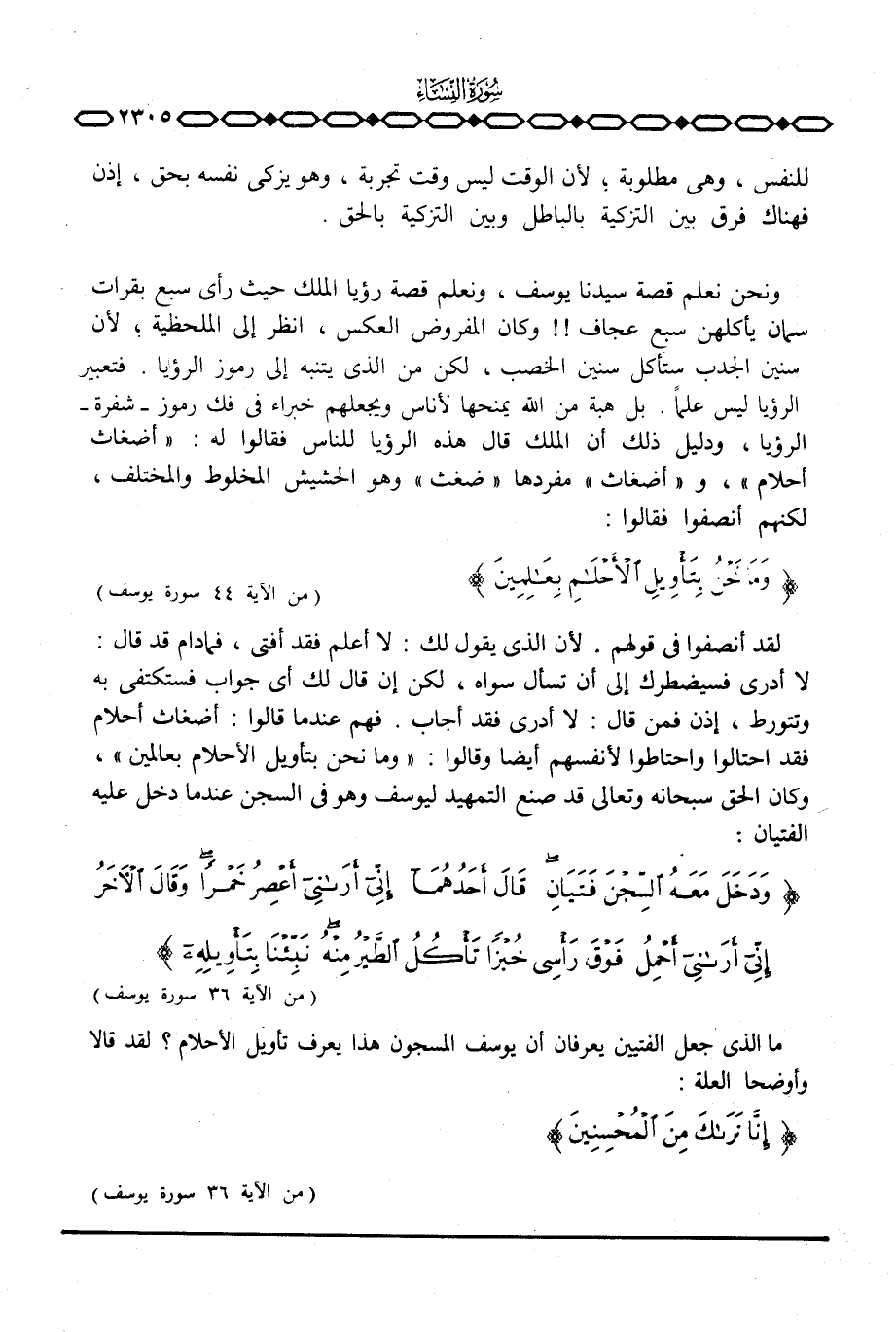 ونحن نعلم قصة سيدنا يوسف، ونعلم قصة رؤيا الملك حيث رأى سبع بقرات سمان يأكلهن سبع عجاف!! وكان المفروض العكس، انظر إلى الملحظية؛ لأن سنين الجدب ستأكل سنين الخصب، لكن من الذي يتنبه إلى رموز الرؤيا. فتعبير الرؤيا ليس علماً. بل هبة من الله يمنحها لأناس ويجعلهم خبراء في فك رموز - شفرة - الرؤيا، ودليل ذلك أن الملك قال هذه الرؤيا للناس فقالوا له: {أَضْغَاثُ أَحْلاَمٍ} ، و «أضغاث» مفردها «ضغث» وهو الحشيش المخلوط والمختلف، لكنهم أنفصفوا فقالوا: