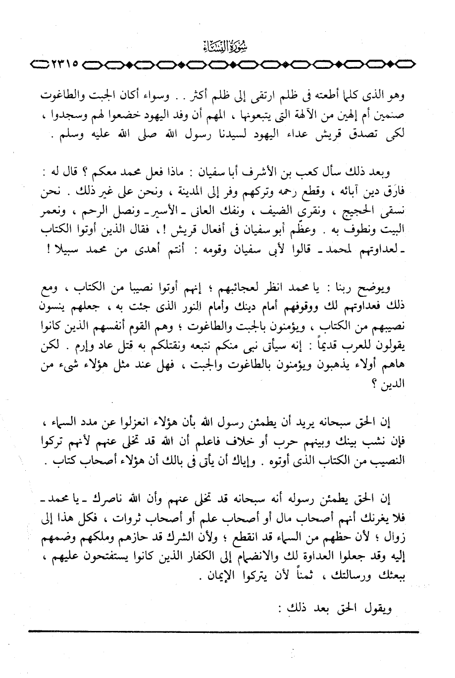 ويوضح ربنا: يا محمد انظر لعجائبهم؛ إنهم أوتوا نصيبا من الكتاب، ومع ذلك فعداوتهم لك ووقوفهم أمام دينك وأمام النور الذي جئت به، جعلهم ينسون نصيبهم من الكتاب، ويؤمنون بالجبت والطاغوت؛ وهم القوم أنفسهم الذين كانوا يقولون للعرب قديماً: إنه سيأتي نبي منكم نتبعه ونقتلكم به قتل عاد وإرم. لكن ها هم أولاء يذهبون ويؤمنون بالطاغوت والجبت، فهل عند مثل هؤلاء شيء من الدين؟