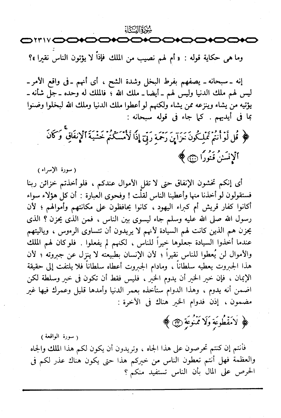 إنه - سبحانه - يصفهم بفرط البخل وشدة الشح، أي أنهم - في واقع الأمر - ليس لهم ملك الدنيا وليس لهم - أيضا - ملك الله؛ فالملك له وحده - جل شأنه - يؤتيه من يشاء وينزعه ممن يشاء ولكنهم لو أعطوا ملك الدنيا وملك الله لبخلوا وضنوا بما في أيديهم. كما جاء في قوله سبحانه: {قُل لَّوْ أَنْتُمْ تَمْلِكُونَ خَزَآئِنَ رَحْمَةِ رَبِّي إِذاً لأمْسَكْتُمْ خَشْيَةَ الإنفاق وَكَانَ الإنسان قَتُوراً} [الإسراء: 100] .