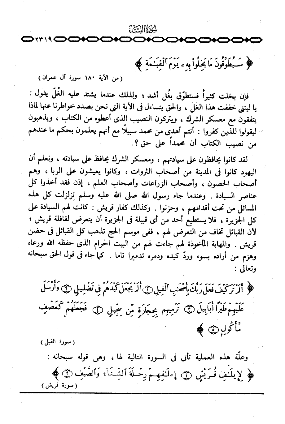 وعلّة هذه العملية تأتي في السورة التالية لها، وهي قوله سبحانه: {لإِيلاَفِ قُرَيْشٍ إِيلاَفِهِمْ رِحْلَةَ الشتآء والصيف} [قريش: 1 - 2] .