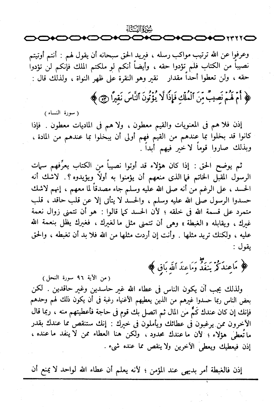 ثم يوضح الحق: إذا كان هؤلاء قد أوتوا نصيباً من الكتاب يعرِّفهم سمات الرسول المقبل الخاتم فما الذي منعهم أن يؤمنوا به أولاً ويؤيدوه؟ . لا شك أنه الحسد، على الرغم من أنه صَلَّى اللَّهُ عَلَيْهِ وَسَلَّم َ جاء مصدقاً لما معهم، إنهم لا شك حسدوا الرسول صَلَّى اللَّهُ عَلَيْهِ وَسَلَّم َ، والحسد لا يتأتى إلا عن قلب حاقد، قلب متمرد على قسمة الله في خلقه؛ لأن الحسد كما قالوا: هو أن تتمنى زوال نعمة غيرك، ويقابله «الغبطة» وهي أن تتمنى مثل ما لغيرك، فغيرك يظل بنعمة الله عليه، ولكنك تريد مثلها.