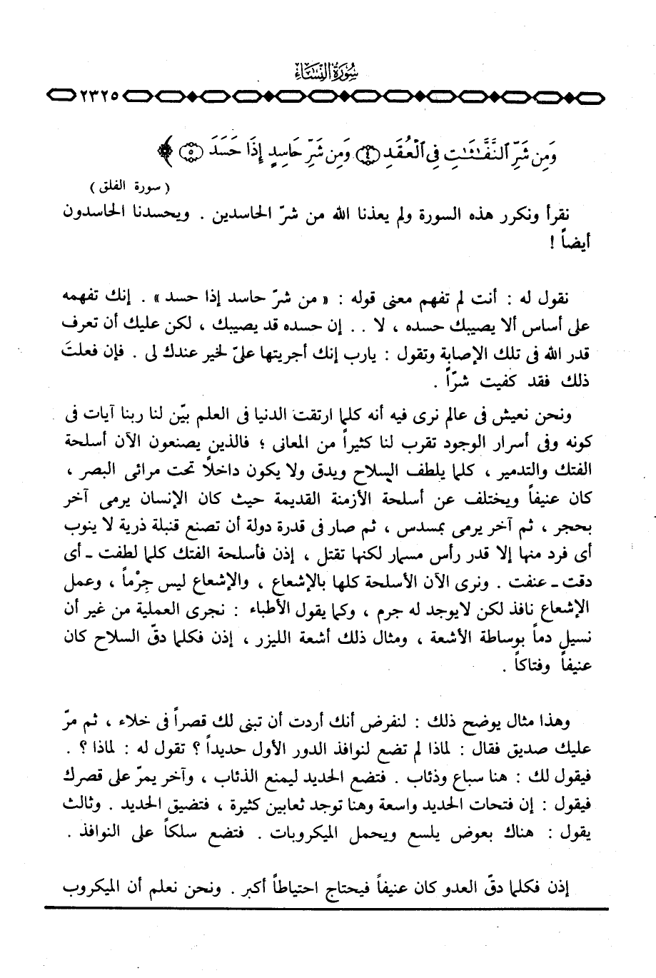 نقول له: أنت لم تفهم معنى قوله: {وَمِن شَرِّ حَاسِدٍ إِذَا حَسَدَ} . إنك تفهمه على أساس ألا يصيبك حسده، لا. . إن حسده قد يصيبك، لكن عليك أن تعرف قدر الله في تلك الإصابة وتقول: يا رب إنك أجريتها عليّ لخير عندك لي. فإن فعلتَ ذلك فقد كفيت شرّاً.