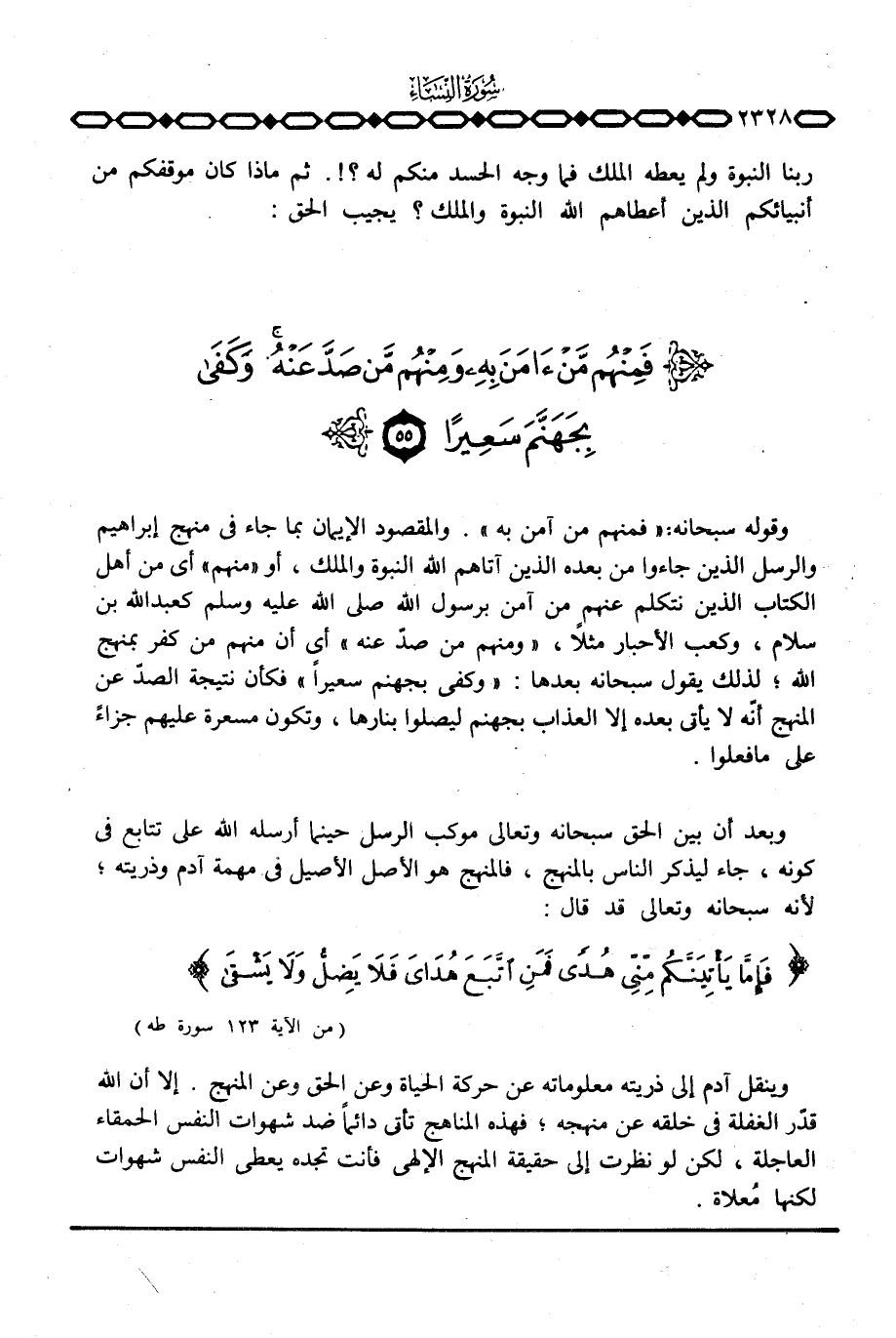 وقوله سبحانه: {فَمِنْهُمْ مَّنْ آمَنَ بِهِ} . والمقصود الإيمان بما جاء في منهج إبراهيم والرسل الذين جاءوا من بعده الذين آتاهم الله النبوة والملك، أو «منهم» أي من أهل الكتاب الذين نتكلم عنه من آمن برسول الله صَلَّى اللَّهُ عَلَيْهِ وَسَلَّم َ كعبد الله بن سلام، وكعب الأحبار مثلاً، {وَمِنْهُمْ مَّن صَدَّ عَنْهُ} أي أن منهم من كفر بمنهج الله؛ لذلك يقول سبحانه بعدها: {وكفى بِجَهَنَّمَ سَعِيراً} فكأن نتيجة الصدّ عن المنهج أنّه لا يأتي بعده إلا العذاب بجهنم ليصلوا بنارها، وتكون مسعرة عليهم جزاءً على ما فعلوا.