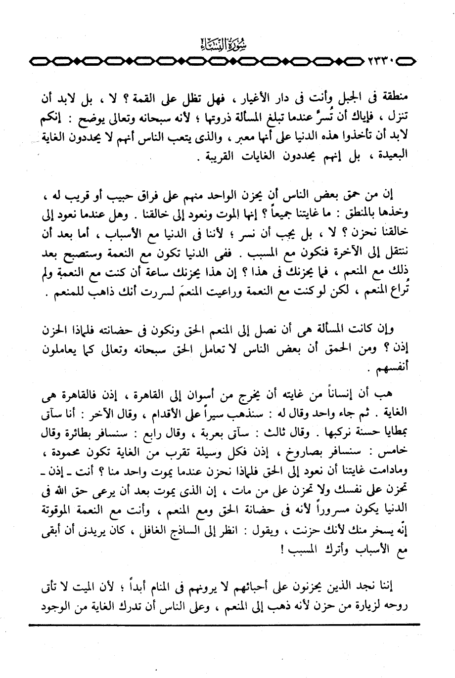 هب أن إنساناً من غايته أن يخرج من أسوان إلى القاهرة، إذن فالقاهرة هي الغاية. ثم جاء واحد وقال له: سنذهب سيراً على الأقدام، وقال الآخر: أنا سآتي بمطايا حسنة نركبها. وقال ثالث: سآتي بعربة، وقال رابع: سنسافر بطائرة وقال خامس. سنسافر بصاروخ، إذن فكل وسيلة تقرب من الغاية تكون محمودة، وما دامت غايتنا أن نعود إلى الحق فلماذا نحزن عندما يموت واحد منا؟ أنت - إذن - تحزن على نفسك ولا تحزن على من مات، إن الذي يموت بعد أن يرعى حق الله في الدنيا يكون مسروراً لأنه في حضانة الحق ومع المنعم، وأنت مع النعمة الموقوتة إنّه يسخر منك لأنك حزنت، ويقول: انظر إلى الساذج الغافل، كان يريدني أن أبقى مع الأسباب وأترك المسبب!