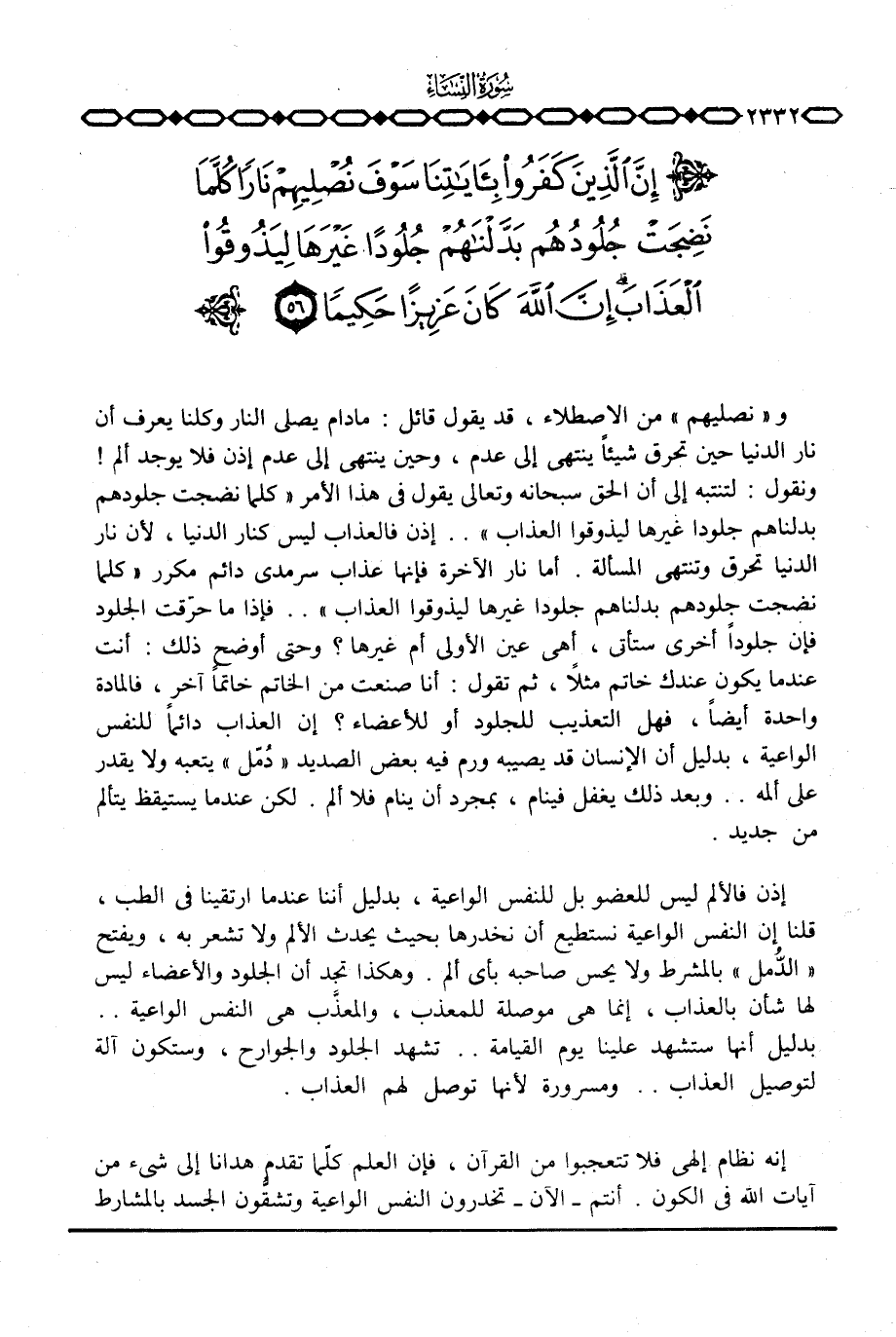 إن فالألم ليس للعضو بل للنفس الواعية، بدليل أننا عندما ارتقينا في الطب، قلنا إن النفس الواعية نستطيع أن نخدرها بحيث يحدث الألم ولا تشعر به، ويفتح «الدُّمل» بالمشرط ولا يحس صاحبه بأي ألم. وهكذا تجد أن الجلود والأعضاء ليس لها شأن بالعذاب، إنما هي موصلة للمعذب، والمعذَّب هي النفس الواعية. . بدليل أنها ستشهد علينا يوم القيامة. . تشهد الجلود والجوارح، وستكون آلة لتوصيل العذاب. . ومسرورة لأنها توصل لهم العذاب.