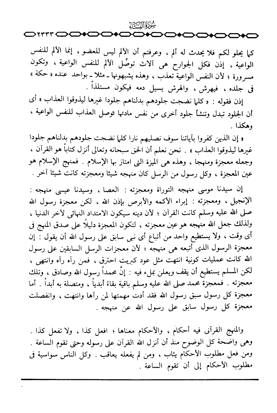 {إِنَّ الذين كَفَرُواْ بِآيَاتِنَا سَوْفَ نُصْلِيهِمْ نَاراً كُلَّمَا نَضِجَتْ جُلُودُهُمْ بَدَّلْنَاهُمْ جُلُوداً غَيْرَهَا لِيَذُوقُواْ العذاب} . ونحن نعلم أن الحق سبحانه وتعالى أنزل كتاباً هو القرآن، وجعله معجزة ومنهجا، وهذه هي الميزة التي امتاز بها الإسلام. فمنهج الإسلام هو عين المعجزة، وكل رسول من الرسل كان منهجه شيئاً ومعجزته كانت شيئا آخر.