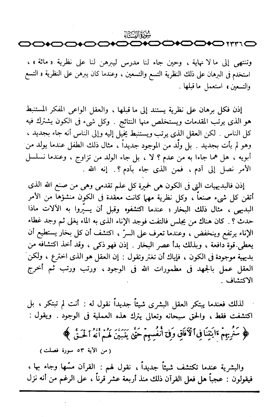 إذن فكل برهان على نظرية يستند إلى ما قبلها، والعقل الواعي المفكر المستنبط هو الذي يرتب المقدمات ويستخلص منها النتائج. وكل شيء في الكون يشترك فيه كل الناس. لكن العقل الذي يرتب ويستنبط يخيل إليه وإلى الناس أنه جاء بجديد، وهو لم يأت بجديد. بل ولَّد من الموجود جديداً، مثال ذلك الطفل عندما يولد من أبويه، هل هما جاءا به من عدم؟ لا، بل جاء الولد من تزاوج، وعندما نسلسل الأمر نصل إلى آدم، فمن الذي جاء بآدم؟ . إنه الله.