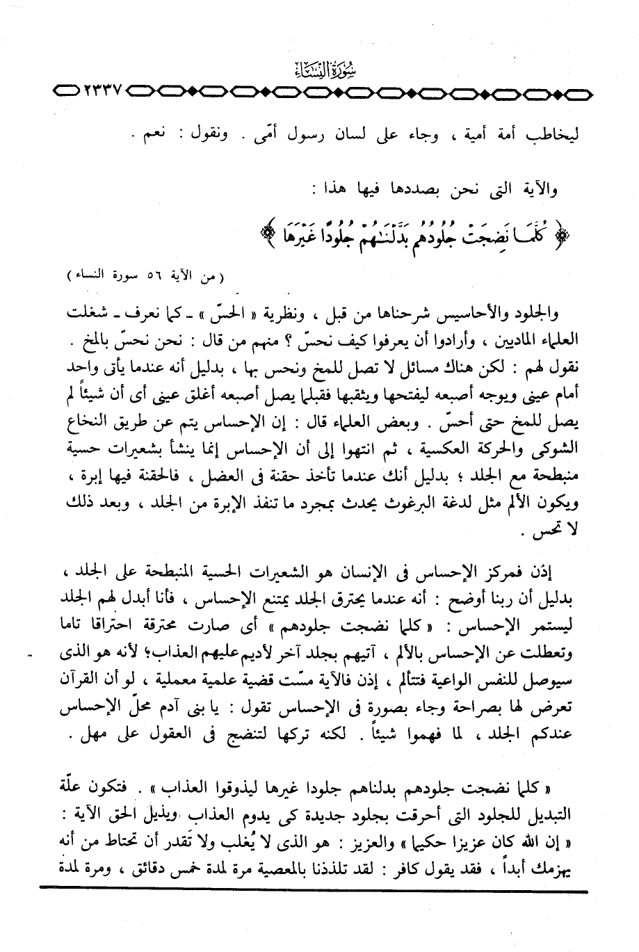 إذن فمركز الإحساس في الإنسان هو الشعيرات الحسية المنبطحة على الجلد، بدليل أن ربنا أوضح: أنه عندما يحترق الجلد يمتنع الإحساس، فأنا أبدل لهم الجلد ليستمر الإحساس: {كُلَّمَا نَضِجَتْ جُلُودُهُمْ} أي صارت محترقة احتراقاً تاما وتعطلت عن الإحساس بالألم، آتيهم بجلد آخر لأديم عليهم العذاب؛ لأنه هو الذي سيوصل للنفس الواعية فتتألم، إذن فالآية مسّت قضية علمية معملية، لو أن القرآن تعرض لها بصراحة وجاء بصورة في الإحساس تقول: يا بني آدم محلّ الإحساس عندكم الجلد، لما فهموا شيئاً. لكنه تركها لتنضج في العقول على مهل.