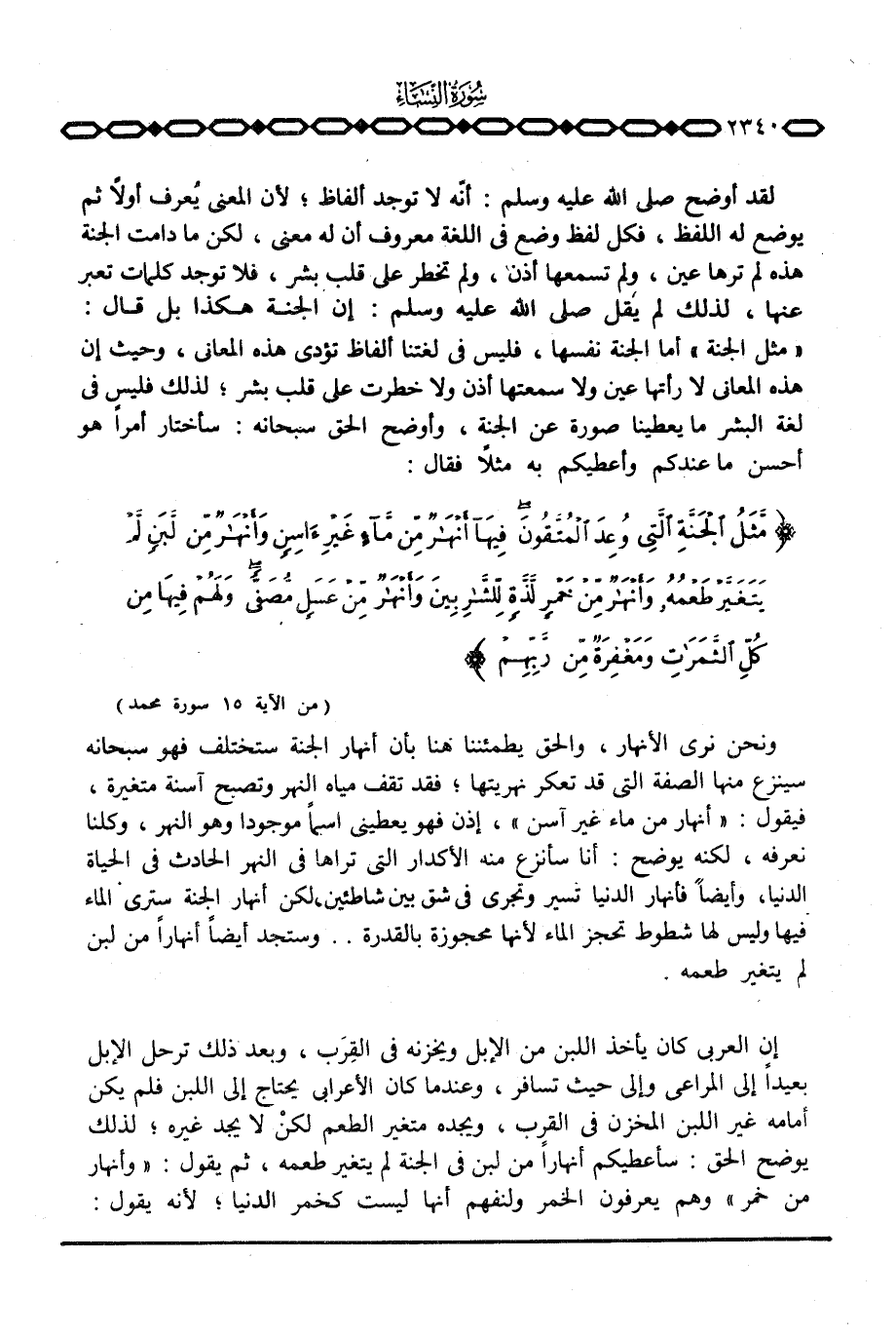 لقد أوضح صَلَّى اللَّهُ عَلَيْهِ وَسَلَّم َ: أنّه لا توجد ألفاظ؛ لأن المعنى يُعرف أولاً ثم يوضع له اللفظ، فكل لفظ وضع في اللغة معروف أن له معنى، لكن ما دامت الجنة هذه لم ترها عين، ولم تسمعها أذن، ولم تخطر على قلب بشر، فلا توجد كلمات تعبر عنها، لذلك لم يقل صَلَّى اللَّهُ عَلَيْهِ وَسَلَّم َ: إن الجنة هكذا بل قال: «مثل الجنة» أما الجنة نفسها، فليس في لغتنا ألفاظ تؤدي هذه المعاني، وحيث إن هذه المعاني لا رأتها عين ولا سمعتها أذن ولا خطرت على قلب بشر؛ لذلك فليس في لغة البشر ما يعطينا صورة عن الجنة، وأوضح الحق سبحانه: سأختار أمراً هو أحسن ما عندكم وأعطيكم به مثلاً فقال: {مَّثَلُ الجنة التي وُعِدَ المتقون فِيهَآ أَنْهَارٌ مِّن مَّآءٍ غَيْرِ آسِنٍ وَأَنْهَارٌ مِّن لَّبَنٍ لَّمْ يَتَغَيَّرْ طَعْمُهُ وَأَنْهَارٌ مِّنْ خَمْرٍ لَّذَّةٍ لِّلشَّارِبِينَ وَأَنْهَارٌ مِّنْ عَسَلٍ مُّصَفًّى وَلَهُمْ فِيهَا مِن كُلِّ الثمرات وَمَغْفِرَةٌ مِّن رَّبِّهِمْ} [محمد: 15] .