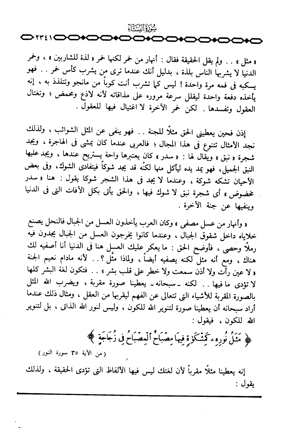 مثل» . . ولم يقل الحقيقة فقال: أنهار من خمر لكنها خمر «لذة للشاربين» ، وخمر الدنيا لا يشربها الناس بلذة، بدليل أنك عندما ترى من يشرب كأس خمر.
