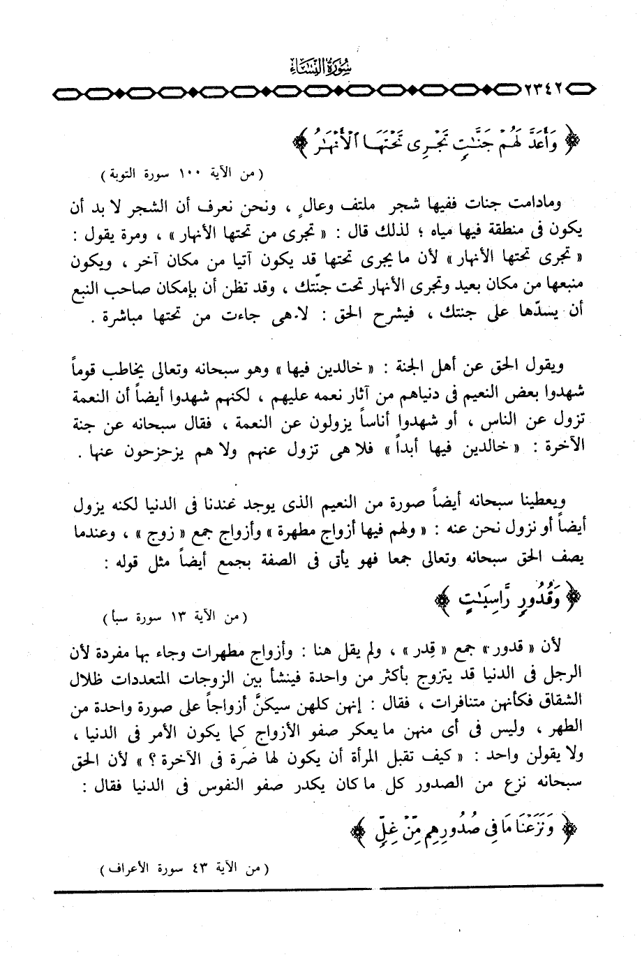 لأن «قدور» جمع «قِدر» ولم يقل هنا: وأزواج مطهرات وجاء بها مفردة لأن الرجل في الدنيا قد يتزوج بأكثر من واحدة فينشأ بين الزوجات المتعددات ظلال الشقاق فكأنهن متنافرات، فقال: إنهن كلهن سيكنَّ أزواجاً على صورة واحدة من الطهر، وليس في أي منهن ما يعكر صفو الأزواج كما يكون الأمر في الدنيا، ولا يقولن واحد: «كيف تقبل المرأة أن يكون لها ضرَة في الآخرة؟» لأن الحق سبحانه نزع من الصدور كل ما كان يكدر صفو النفوس في الدنيا فقال: {وَنَزَعْنَا مَا فِي صُدُورِهِم مِّنْ غِلٍّ} [الأعراف: 43] .
