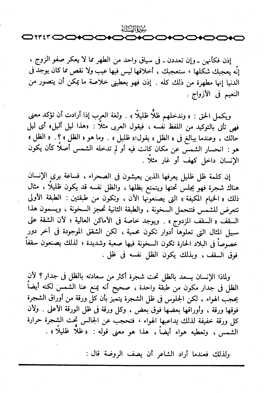 إن كلمة ظل ظليل يعرفها الذين يعيشون في الصحراء، فساعة يرى الإنسان هناك شجرة فهو يجلس تحتها ويتمتع بظلها، والظل نفسه قد يكون ظليلاً، مثال ذلك «الخيام المكيفة» التي يصنعونها الآن، وتكون من طبقتين: الطبقة الأولى تتعرض للشمس فتتحمل السخونة، والطبقة الثانية تحجز السخونة، ويسمون هذا السقف «السقف المزدوج» . ويوجد خاصة في الأماكن العالية؛ لأن الشقة على سبيل المثال التي تعلوها أدوار تكون محمية، لكن الشقق الموجودة في آخر دور خصوصاً في البلاد الحارة تكون السخونة فيها صعبة وشديدة؛ لذلك يصنعون سقفاً فوق السقف، وبذلك يكون الظل نفسه في ظل.