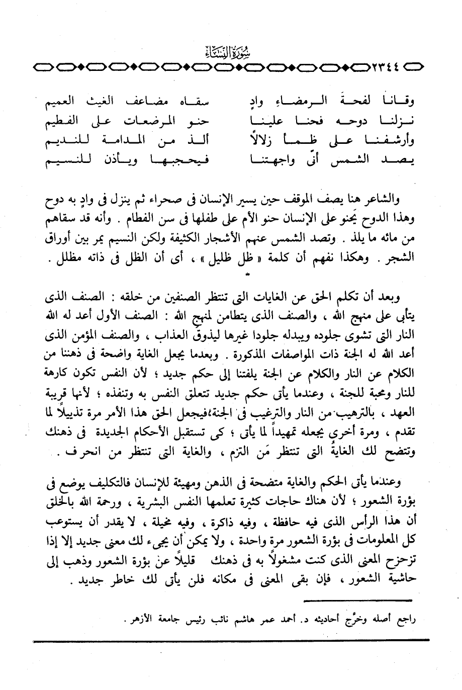 وبعد أن تكلم الحق عن الغايات التي تنتظر الصنفين من خلقه: الصنف الذي يتأبى على منهج الله، والصنف الذي يتطامن لمنهج الله: الصنف الأول أعد له الله النار التي تشوي جلوده ويبدله جلوداً غيرها ليذوق العذاب، والصنف المؤمن الذي أعد الله له الجنة ذات المواصفات المذكورة. وبعدما يجعل الغاية واضحة في ذهننا من الكلام عن النار والكلام عن الجنة يلفتنا إلى حكم جديد؛ لأن النفس تكون كارهة للنار ومحبة للجنة، وعندما يأتي حكم جديد تتعلق النفس به وتنفذه؛ لأنها قريبة العهد، بالترهيب من النار والترغيب في الجنة، فيجعل الحق هذا الأمر مرة تذييلاً لما تقدم، ومرة أخرى يجعله تمهيداً لما يأتي؛ كي تستقبل الأحكام الجديدة في ذهنك وتتضح لك الغاية التي تنتظر مَن التزم، والغاية التي تنتظر من انحرف.