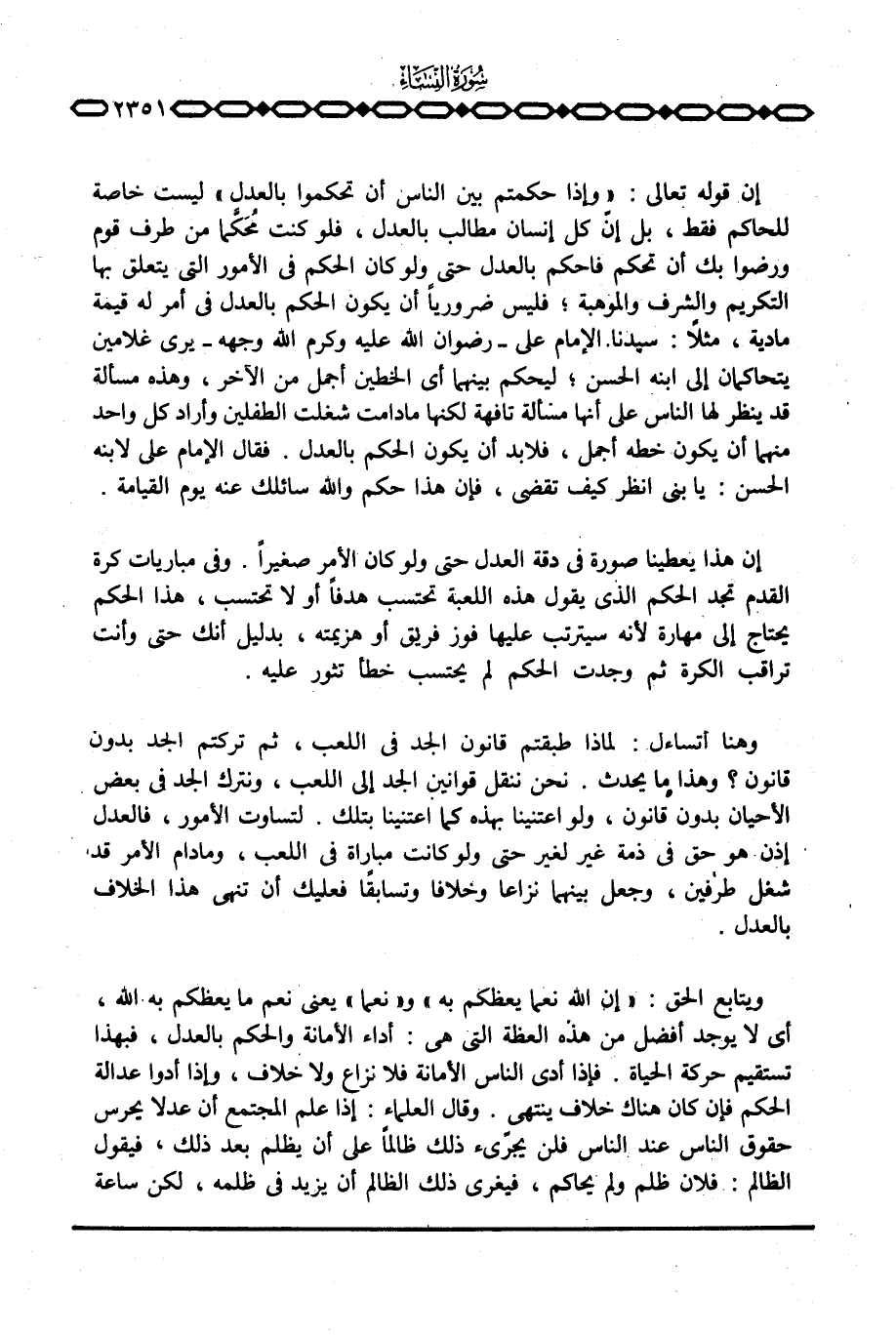 إن قوله تعالى: {وَإِذَا حَكَمْتُمْ بَيْنَ الناس أَن تَحْكُمُواْ بالعدل} ليست خاصة للحاكم فقط، بل إنّ كل إنسان مطالب بالعدل، فلو كنت مُحَكَّماً من طرف قوم ورضوا بك أن تحكم فاحكم بالعدل حتى ولو كان الحكم في الأمور التي يتعلق بها التكريم والشرف والموهبة؛ فليس ضرورياً أن يكون الحكم بالعدل في أمر له قيمة مادية، مثلاً: سيدنا الإمام علي - رضوان الله عليه وكرم الله وجهه - يرى غلامين يتحاكمان إلى ابنه الحسن؛ ليحكم بينهما أي الخطين أجمل من الآخر، وهذه المسألة قد ينظر لها الناس على أنها مسألة تافهة لكنها ما دامت شغلت الطفلين وأراد كل واحد منهما أن يكون خطه أجمل، فلا بد أن يكون الحكم بالعدل. فقال الإمام على لابنه الحسن: يا بني انظر كيف تقضي، فإن هذا حكم والله سائلك عنه يوم القيامة.