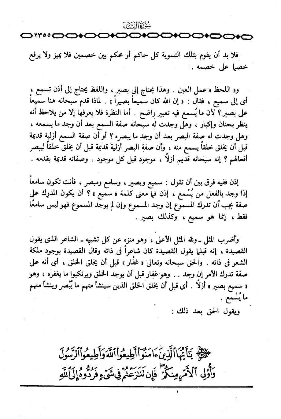 و» اللحظ «عمل العين. وهذا يحتاج إلى بصير، واللفظ يحتاج إلى أذن تسمع، أي إلى سميع، فقال: {إِنَّ الله كَانَ سَمِيعاً بَصِيراً} . لماذا قدم سبحانه هنا سميعاً على بصير؟ لأن ما يُسمع فيه تعبير واضح. أما النظرة فلا يعرفها إلا من يلاحظ أنه ينظر بحنان وإكبار، وهل وجدت له سبحانه صفة السمع بعد أن وجد ما يسمعه، وهل وجدت له صفة البصر بعد أن وجد ما يبصره؟ أو أن صفة السمع أزلية قديمة قبل أن يخلق خلقاً يسمع منه، وأن صفة البصر أزلية قديمة قبل أن يخلق خلقاً ليبصر أفعالهم؟ إنه سبحانه قديم أزلاً، موجود قبل كل موجود. وصفاته قديمة بقدمه.