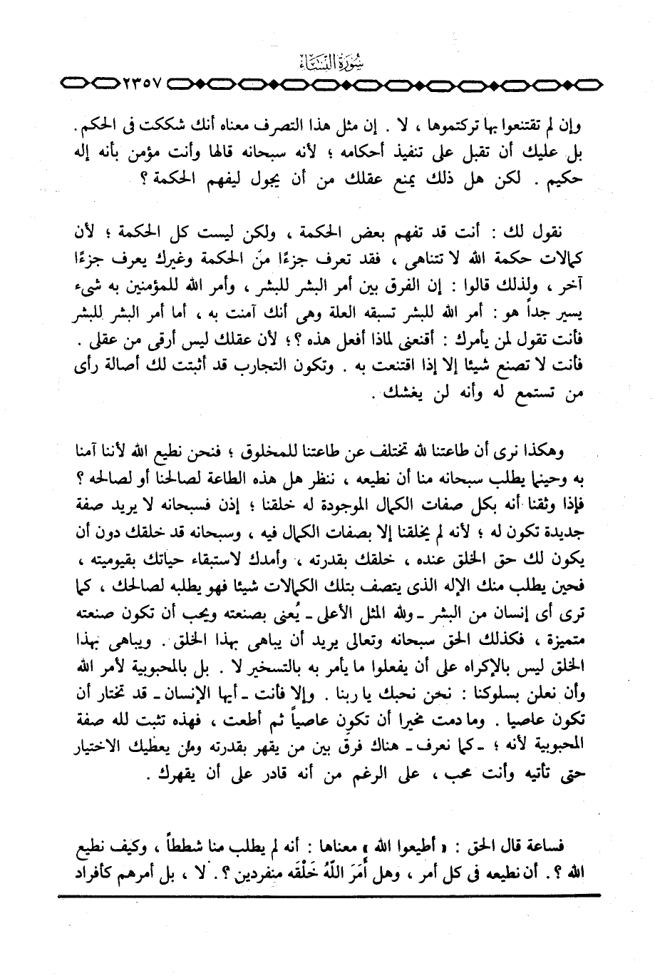 نقول لك: أنت قد تفهم بعض الحكمة، ولكن ليست كل الحكمة؛ لأن كمالات حكمة الله لا تتناهى، فقد تعرف جزءاً من الحكمة وغيرك يعرف جزءاً آخر، ولذلك قالوا: إن الفرق بين أمر البشر للبشر، وأمر الله للمؤمنين به شيء يسير جداً هو: أمر الله للبشر تسبقه العلة وهي أنك آمنت به، أما أمر البشر للبشر فأنت تقول لمن يأمرك: أقنعني لماذا أفعل هذه؟؛ لأن عقلك ليس أرقى من عقلي.