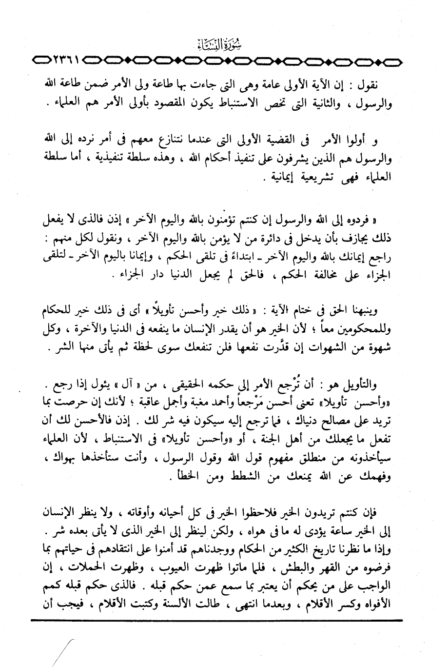 وأولوا الأمر في القضية الأولى التي عندما نتنازع معهم في أمر نرده إلى الله والرسول هم الذين يشرفون على تفنيذ أحكام الله، وهذه سلطة تنفيذية، أما سلطة العلماء فهي تشريعية إيمانية.
