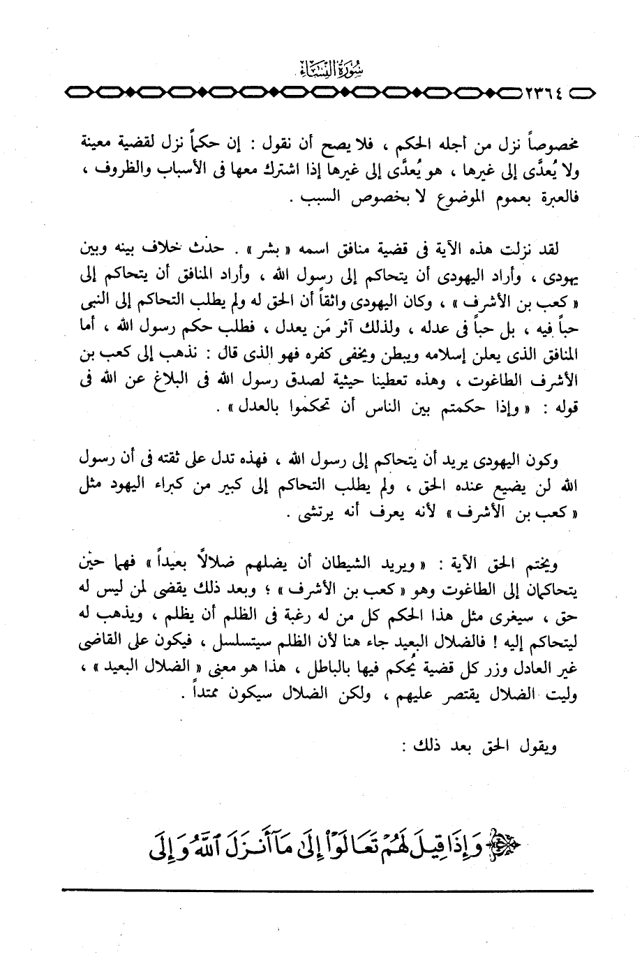 حدث خلاف بينه وبين يهودي، وأراد اليهودي أن يتحاكم إلى رسول الله، وأراد المنافق أن يتحاكم إلى «كعب بن الأشرف» ، وكان اليهودي واثقاً أن الحق له ولم يطلب التحاكم إلى النبي حباً فيه، بل حباُ في عدله، ولذلك آثر مَن يعدل، فطلب حكم رسول الله، أما المنافق الذي يعلن إسلامه ويبطن ويخفي كفره فهو الذي قال: نذهب إلى كعب بن الأشرف الطاغوت، وهذه تعطينا حيثية لصدق رسول الله في البلاغ عن الله في قوله: {وَإِذَا حَكَمْتُمْ بَيْنَ الناس أَن تَحْكُمُواْ بالعدل} .