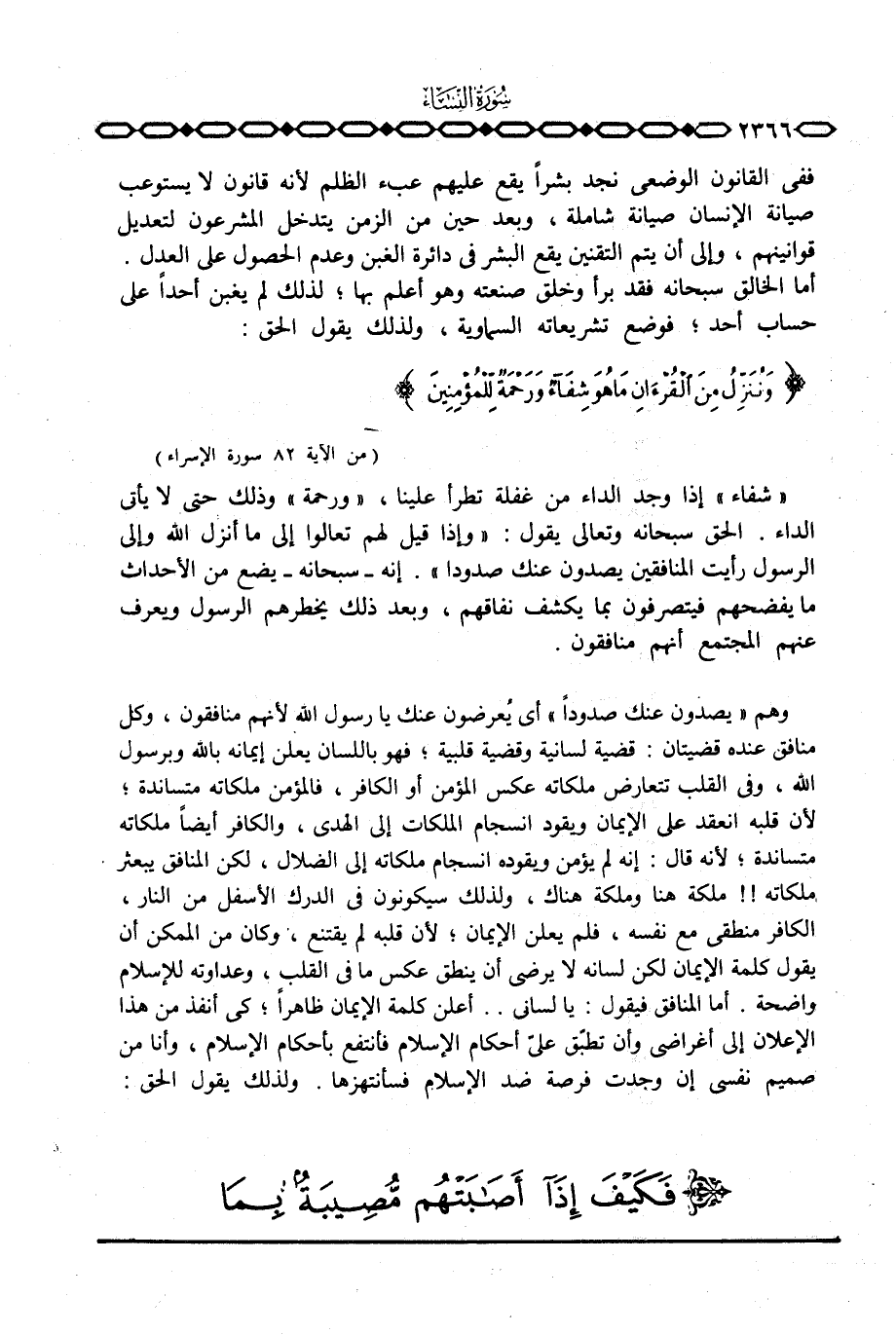 «شفاء» إذا وجد الداء من غفلة تطرأ علينا، «ورحمة» وذلك حتى لا يأتي الداء. الحق سبحانه وتعالى يقول: {وَإِذَا قِيلَ لَهُمْ تَعَالَوْاْ إلى مَآ أَنزَلَ الله وَإِلَى الرسول رَأَيْتَ المنافقين يَصُدُّونَ عَنكَ صُدُوداً} . إنه - سبحانه - يضع من الأحداث ما يفضحهم فيتصرفون بما يكشف نفاقهم، وبعد ذلك يخطرهم الرسول ويعرف عنهم المجتمع أنهم منافقون.