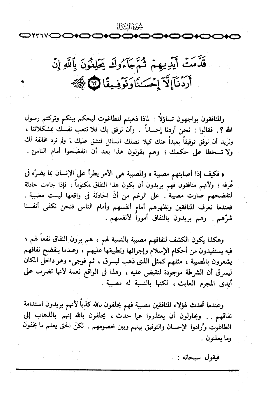 وعندما تحدث لهؤلاء المنافقين مصيبة فهم يحلفون بالله كذباً لأنهم يريدون استدامة نفاقهم. . ويحاولون أن يعتذروا عما حدث، يحلفون بالله إنهم بالذهاب إلى الطاغوت وأرادوا الإحسان والتوفيق بينهم وبين خصومهم. لكن الحق يعلم ما يخفون وما يعلنون.