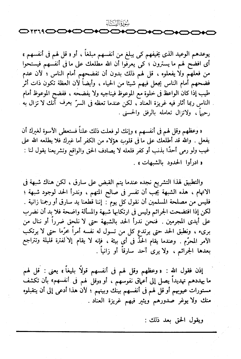 فنحن ندرأ الحد بالشبهة حتى لا نلحق ضرراً أو ننال من بريء، ونطق الحد حتى يرتدع كل من تسول له نفسه أمراً محرّما حتى لا يرتكب الأمر المحرّم. وعندما يقام الحدّ في أي بيئة، فإنه لا يقام إلا لفترة قليلة وتتراجع بعدها الجرائم، ولا يرى أحد سارقاً أو زانياً.