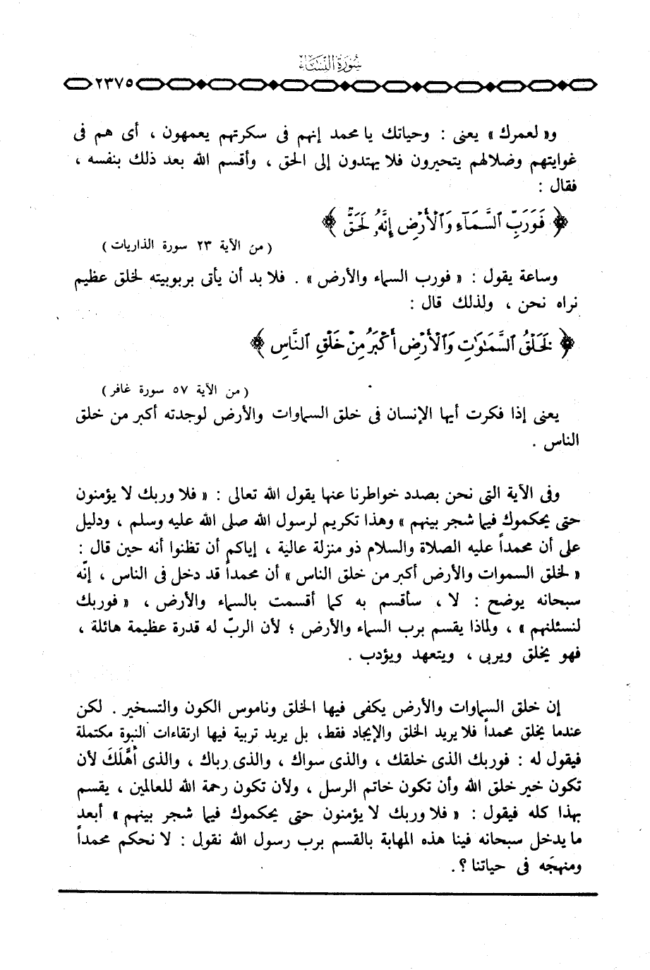 وفي الآية التي نحن بصدد خواطرنا عنها يقول الله تعالى: {فَلاَ وَرَبِّكَ لاَ يُؤْمِنُونَ حتى يُحَكِّمُوكَ فِيمَا شَجَرَ بَيْنَهُمْ} وهذا تكريم لرسول الله صَلَّى اللَّهُ عَلَيْهِ وَسَلَّم َ، ودليل على أن محمداً عَلَيْهِ الصَّلَاة وَالسَّلَام ُ ذو منزلة عالية، إياكم أن تظنوا أنه حين قال: «لخلق السماوات والأرض أكبر من خلق الناس» أن محمداً قد دخل في الناس، إنّه سبحانه يوضح: لا، سأقسم به كما أقسمت بالسماء والأرض، {فَوَرَبِّكَ لَنَسْأَلَنَّهُمْ} ، ولماذا يقسم برب السماء والأرض؛ لأن الربّ له قدرة عظيمة هائلة، فهو يخلق ويربي، ويتعهد ويؤدب.