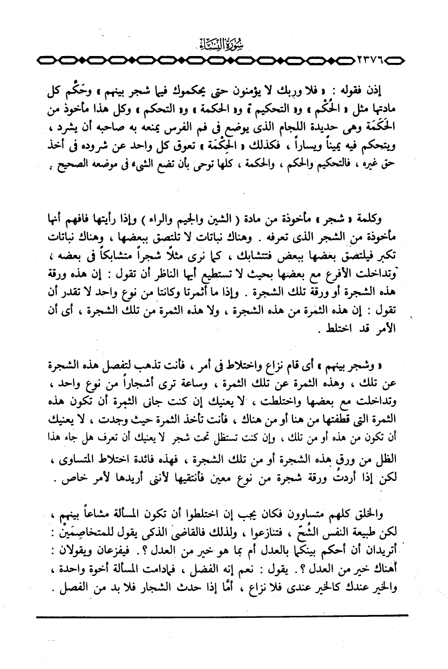«وشجر بينهم» أي قام نزاع واختلاط في أمر، فأنت تذهب لتفصل هذه الشجرة عن تلك، وهذه الثمرة عن تلك الثمرة، وساعة ترى أشجاراً من نوع واحد، وتداخلت مع بعضها واختلطت، لا يعينك إن كنت جاني الثمرة أن تكون هذه الثمرة التي قطفتها من هنا أو من هناك، فأنت تأخذ الثمرة حيث وجدت، لا يعنيك أن تكون من هذه أو من تلك، وإن كنت تستظل تحت شجر لا يعنيك أن تعرف هل جاء هذا الظل من ورق هذه الشجرة أو من تلك الشجرة، فهذه فائدة اختلاط المتساوي، لكن إذا أردت ورقة شجرة من نوع معين فأنتقيها لأنني أريدها لأمر خاص.