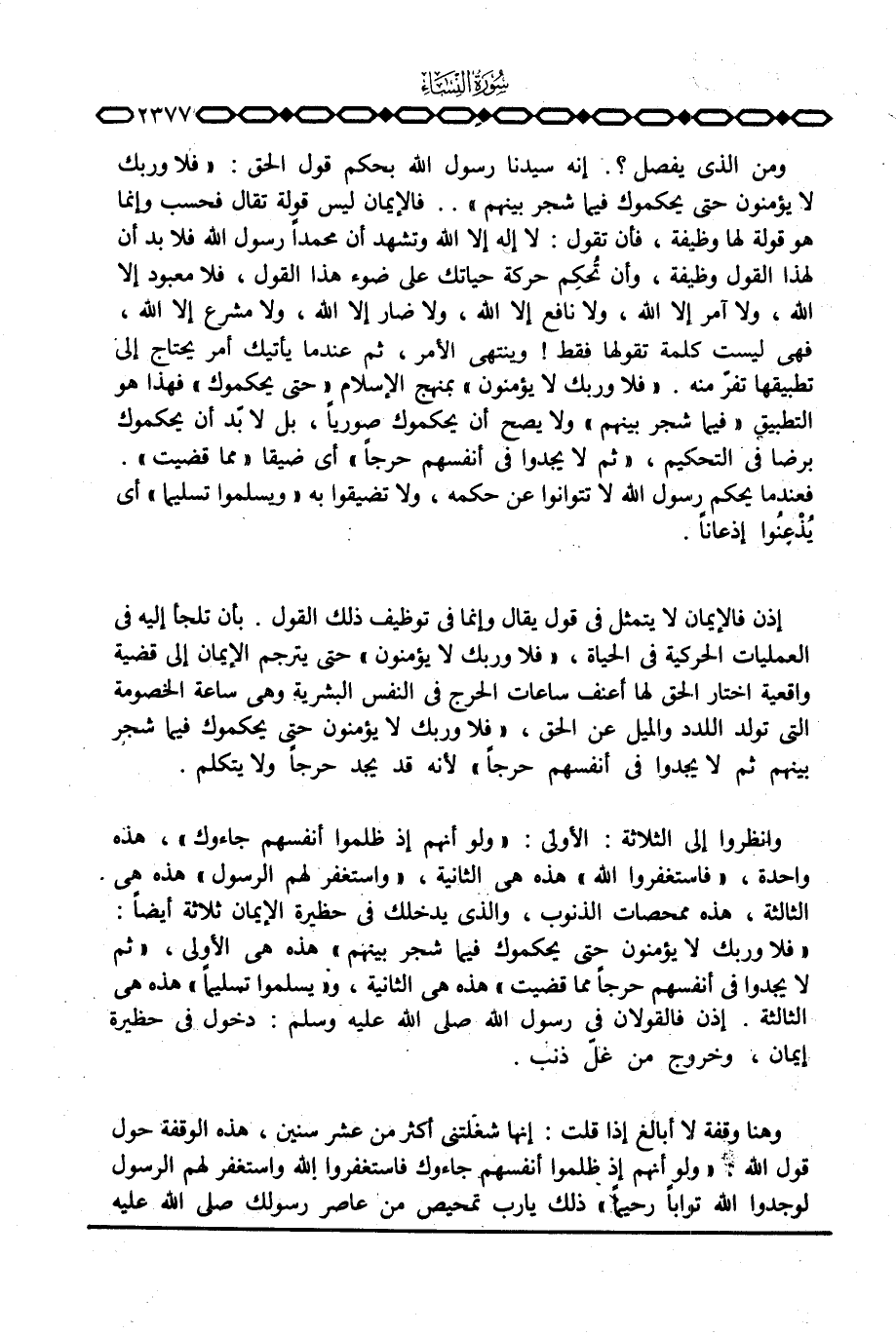إذن فالإيمان لا يتمثل في قول يقال وإنما في توظيف ذلك القول. بأن تلجأ إليه في العمليات الحركية في الحياة، {فَلاَ وَرَبِّكَ لاَ يُؤْمِنُونَ} حتى يترجم الإيمان إلى قضية واقعية اختار الحق لها أعنف ساعات الحرج في النفس البشرية وهي ساعة الخصومة التي تولد اللدد والميل عن الحق، {فَلاَ وَرَبِّكَ لاَ يُؤْمِنُونَ حتى يُحَكِّمُوكَ فِيمَا شَجَرَ بَيْنَهُمْ ثُمَّ لاَ يَجِدُواْ في أَنْفُسِهِمْ حَرَجاً} لأنه قد يجد حرجاً ولا يتكلم.