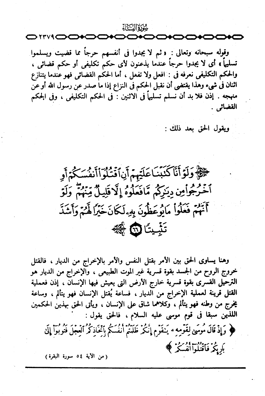 وهنا يساوي الحق بين الأمر بقتل النفس والأمر بالإخراج من الديار، فالقتل خروج الروح من الجسد بقوة قسرية غير الموت الطبيعي، والإخراج من الديار هو الترحيل القسري بقوة قسرية خارج الأرض التي يعيش فيها الإنسان، إذن فعملية القتل قرينة لعملية الإخراج من الديار فساعة يُقتل الإنسان فهو يتألم، وساعة يخرج من وطنه فهو يتألم، وكلاهما شاق على الإنسان، ويأتي الحق بهذين الحكمين اللذين سبقا في قوم موسى عليه السلام، فالحق يقول: {وَإِذْ قَالَ موسى لِقَوْمِهِ يَاقَوْمِ إِنَّكُمْ ظَلَمْتُمْ أَنْفُسَكُمْ باتخاذكم العجل فتوبوا إلى بَارِئِكُمْ فاقتلوا أَنفُسَكُمْ} [البقرة: 54] .