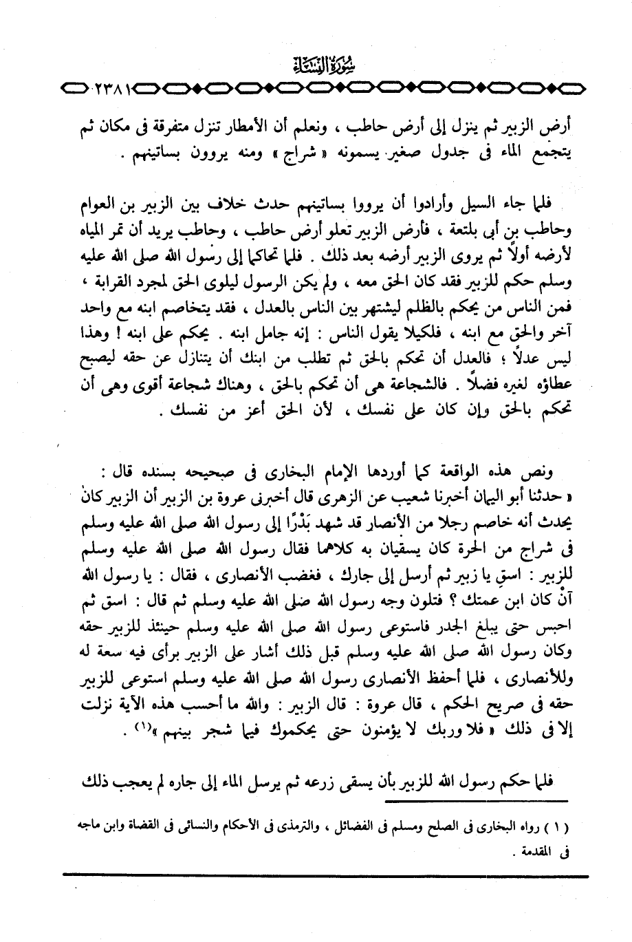 ونص هذه الواقعة كما أوردها الإمام البخاري في صحيحه بسنده قال: «حدثنا أبو اليمان أخبرنا شعيب عن الزهري قال أخبرني عروة بن الزبير أن الزبير كان يحدث أنه خاصم رجلا من الأنصار قد شهد بَدْراً إلى رسول الله صَلَّى اللَّهُ عَلَيْهِ وَسَلَّم َ في شراج من الحرة كان يسقيان به كلاهما فقال رسول الله عليه وسلم للزبير: اسقِ يا زبير ثم أرسل إلى جارك، فغضب الأنصاري، فقال: يا رسول الله آنْ كان ابن عمتك؟ فتلون وجه رسول الله صَلَّى اللَّهُ عَلَيْهِ وَسَلَّم َ ثم قال: اسق ثم احبس حتى يبلغ الجدر فاستوعى رسول الله صَلَّى اللَّهُ عَلَيْهِ وَسَلَّم َ حينئذ للزبير حقه وكان رسول الله صَلَّى اللَّهُ عَلَيْهِ وَسَلَّم َ قبل ذلك أشار على الزبير برأي فيه سعة له وللأنصاري، فلما أحفظ الأنصاري رسول الله صَلَّى اللَّهُ عَلَيْهِ وَسَلَّم َ استوعى للزبير حقه في صريح الحكم، قال عروة: قال الزبير: والله ما أحسب هذه الآية نزلت إلا في ذلك {فَلاَ وَرَبِّكَ لاَ يُؤْمِنُونَ حتى يُحَكِّمُوكَ فِيمَا شَجَرَ بَيْنَهُمْ} .