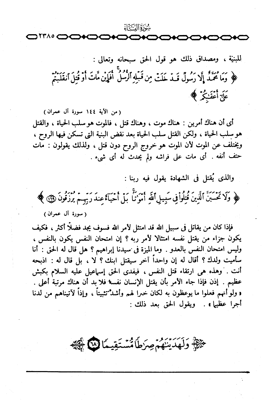 فإذا كان من يقاتل في سبيل الله قد امتثل لأمر الله فسوف يجد فضلاً أكثر، فكيف يكون جزاء من يقتل نفسه امتثالا لأمر ربه؟ إن امتحان النفس يكون بالنفس، وليس امتحان النفس بالعدو. وما الميزة في سيدنا إبراهيم؟ هل قال له الحق: أنا سأميت ولدك؟ أقال له إن واحداً آخر سيقتل ابنك؟ لا، بل قال له: اذبحه أنت. وهذه هي ارتقاء قتل النفس، فيفدي الحق إسماعيل عليه السلام بكبش عظيم. إذن فإذا جاء الأمر بأن يقتل الإنسان نفسه فلا بد أن هناك مرتبة أعلى. {وَلَوْ أَنَّهُمْ فَعَلُواْ مَا يُوعَظُونَ بِهِ لَكَانَ خَيْراً لَّهُمْ وَأَشَدَّ تَثْبِيتاً وَإِذاً لأَتَيْنَاهُم مِّن لَّدُنَّآ أَجْراً عَظِيماً} . ويقول الحق بعد ذلك: {وَلَهَدَيْنَاهُمْ صِرَاطاً ... } .