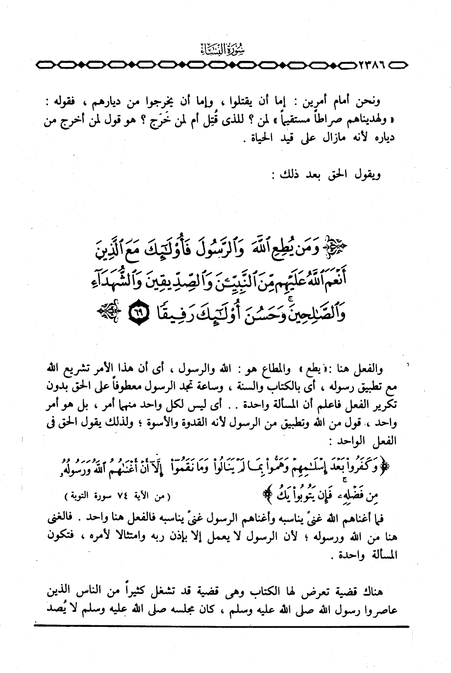 والفعل هنا: «يطع» والمطاع هو: الله والرسول، أي أن هذا الأمر تشريع الله مع تطبيق رسوله، أي بالكتاب والسنة، وساعة تجد الرسول معطوفاً على الحق بدون تكرير الفعل فاعلم أن المسألة واحدة. . أي ليس لكل واحد منهما أمر، بل هو أمر واحد، قول من الله وتطبيق من الرسول لأنه القدوة والأسوة؛ ولذلك يقول الحق في الفعل الواحد: {وَكَفَرُواْ بَعْدَ إِسْلاَمِهِمْ وَهَمُّواْ بِمَا لَمْ يَنَالُواْ وَمَا نقموا إِلاَّ أَنْ أَغْنَاهُمُ الله وَرَسُولُهُ مِن فَضْلِهِ فَإِن يَتُوبُواْ يَكُ} [التوبة: 74] .