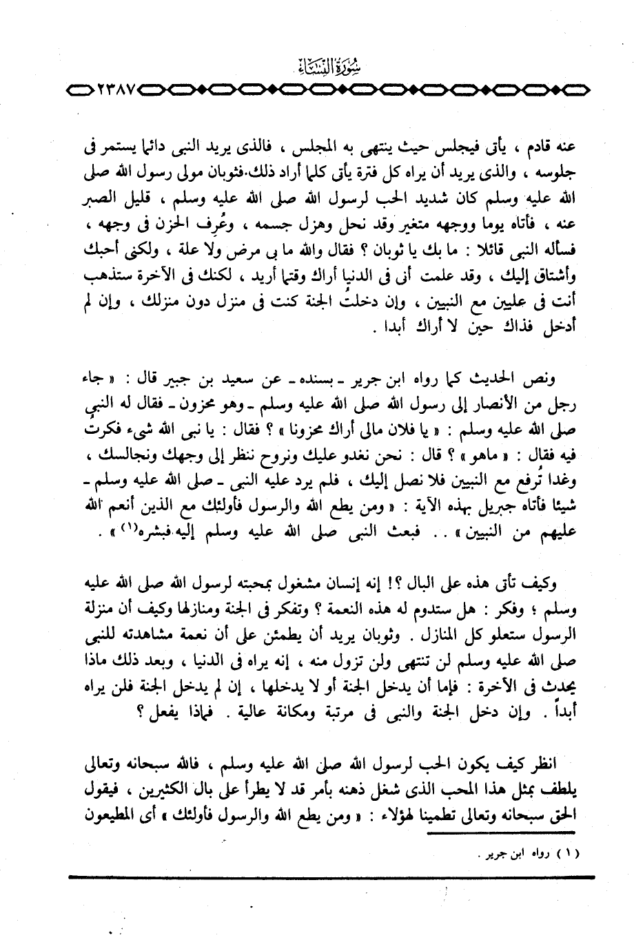 ونص الحديث كما رواه ابن جرير - بسنده - عن سعيد بن جبير قال: «جاء رجل من الأنصار إلى رسول الله صَلَّى اللَّهُ عَلَيْهِ وَسَلَّم َ - وهو محزون - فقال له النبي صَلَّى اللَّهُ عَلَيْهِ وَسَلَّم َ:» يا فلان مالي أراك محزوناً «؟ فقال: يا نبي الله شيء فكرت فيه فقال:» ما هو «؟ قال: نحن نغدو عليك ونروح ننظر إلى وجهك ونجالسك، وغدا تُرفع مع النبيين فلا نصل إليك، فلم يرد عليه النبي - صَلَّى اللَّهُ عَلَيْهِ وَسَلَّم َ - شيئاً فأتاه جبريل بهذه الآية:» ومن يطع الله والرسول فأولئك مع الذين أنعم الله عليهم من النبيين «. . فبعث النبي صَلَّى اللَّهُ عَلَيْهِ وَسَلَّم َ إليه فبشره.
