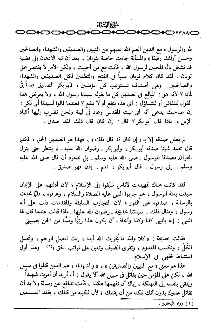 لم يعلل صدقه إلا ب «إن كان قد قال ذلك» ، فهذا هو الصديق الحق، فكلما قال محمد شيئا صدقه أبو بكر، وأبو بكر - رضوان الله عليه - لم ينتظر حتى ينزل القرآن مصدقا للرسول - صَلَّى اللَّهُ عَلَيْهِ وَسَلَّم َ - بل بمجرد أن قال صَلَّى اللَّهُ عَلَيْهِ وَسَلَّم َ: إني رسول. قال أبو بكر: نعم. إذن فهو صديق.