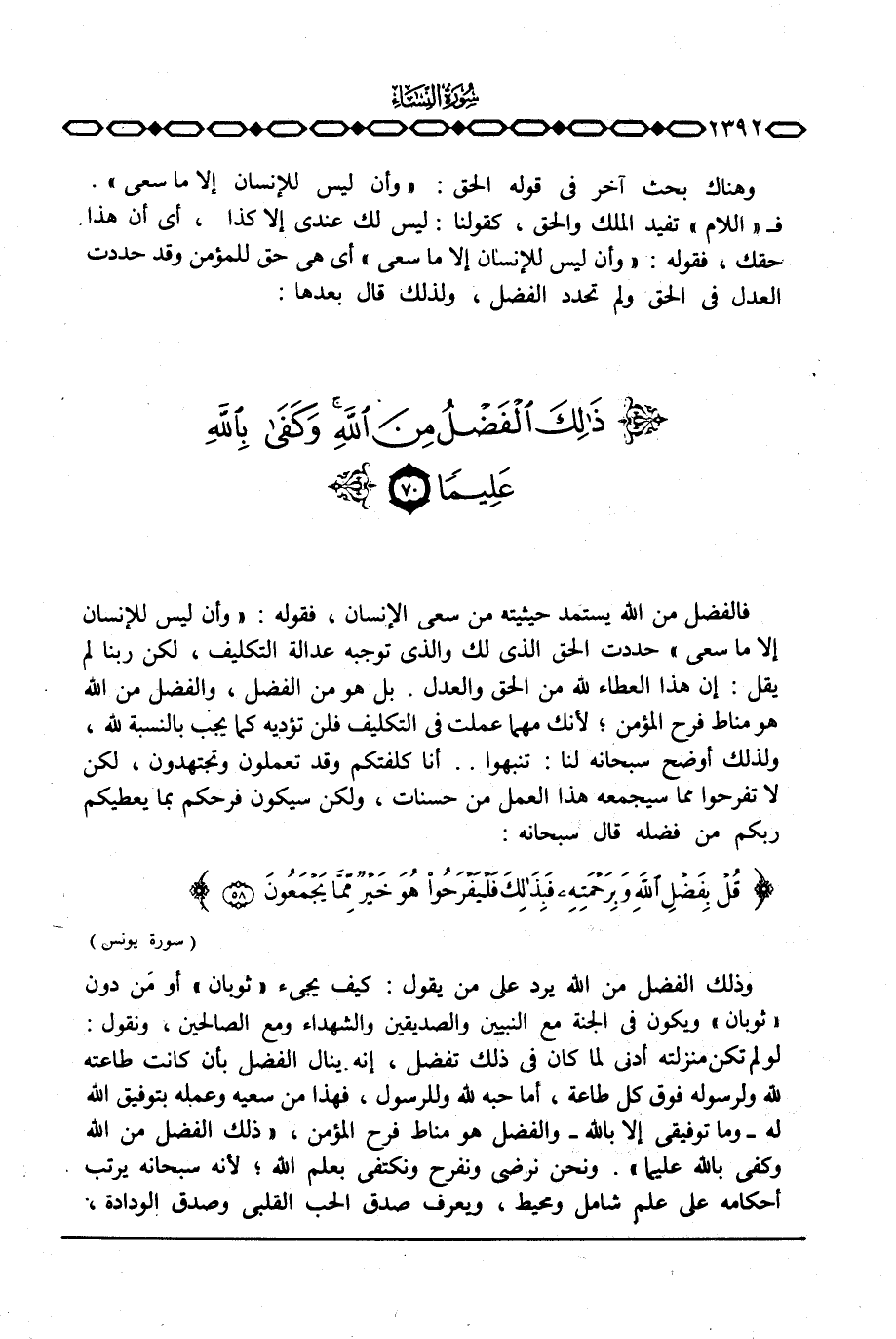 وهناك بحث آخر في قوله الحق: {وَأَن لَّيْسَ لِلإِنسَانِ إِلاَّ مَا سعى} . ف «اللام» تفيد الملك والحق، كقولنا: ليس لك عندي إلا كذا، أي أن هذا حقك، فقوله: {وَأَن لَّيْسَ لِلإِنسَانِ إِلاَّ مَا سعى} أي هي حق للمؤمن وقد حددت العدل في الحق ولم تحدد الفضل، ولذلك قال بعدها: {ذلك الفضل ... } .