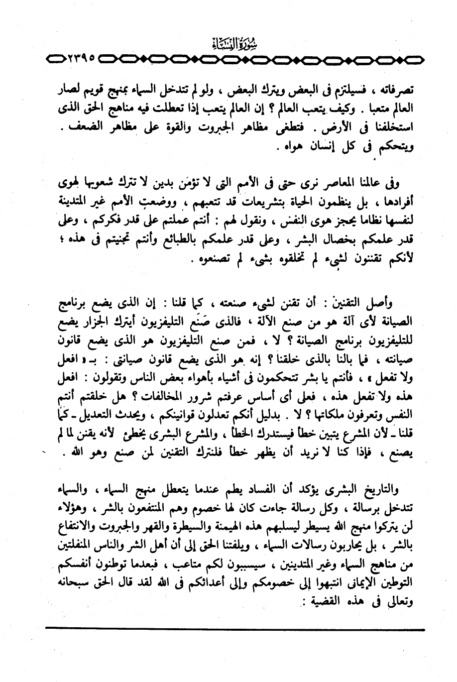 تصرفاته، فسيلتزم في البعض ويترك البعض، ولو لم تتدخل المساء بمنهج قويم لصار العالم متعبا.