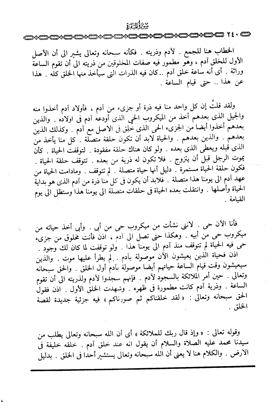 ولقد قلتُ إن كل واحد منا فيه ذرة أو جزئ من آدم، فأولاد آدم أخذوا منه والجيل الذي بعدهم أخذ من الميكروب الحي الذي أودعه آدم في أولاده. والذين بعدهم أخذوا أيضا من الجزيء الحي الذي خُلِق في الأصل مع آدم. وكذلك الذين بعدهم. والذين بعدهم. والحياة لابد أن تكون حلقة متصلة. كل منا يأخذ من الذي قبله ويعطي الذي بعده. ولو كان هناك حلقة مفقودة. لتوقفت الحياة. كأن يموت الرجل قبل أن يتزوج. فلا تكون له ذرية من بعده. تتوقف حلقة الحياة. فكون حلقة الحياة مستمرة. دليل أنها حياة متصلة. لم تتوقف. ومادامت الحياة من عهد آدم إلى يومنا هذا متصلة. فلابد أن يكون في كل منا ذرة من آدم الذي هو بداية الحياة وأصلها. وانتقلت بعده الحياة في حلقات متصلة إلى يومنا هذا وستظل إلى يوم القيامة.