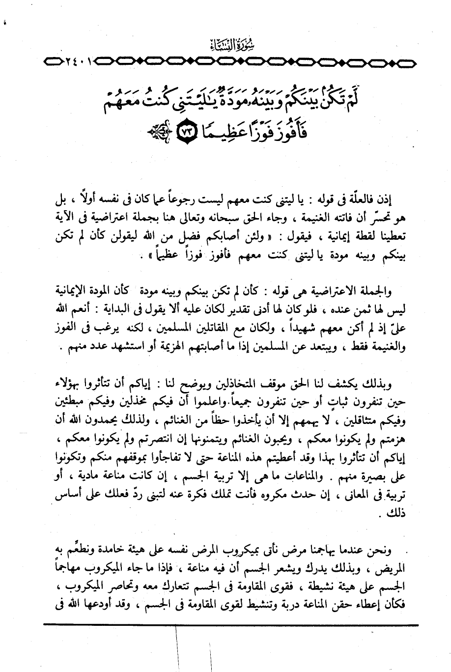 إذن فالعلّة في قوله: يا ليتني كنت معهم ليست رجوعاً عما كان في نفسه أولاً، بل هو تحسرّ أن فاتته الغنيمة، وجاء الحق سبحانه وتعالى هنا بجملة اعتراضية في الآية تعطينا لقطة إيمانية، فيقول: {وَلَئِنْ أَصَابَكُمْ فَضْلٌ مِنَ الله لَيَقُولَنَّ كَأَن لَّمْ تَكُنْ بَيْنَكُمْ وَبَيْنَهُ مَوَدَّةٌ ياليتني كُنتُ مَعَهُمْ فَأَفُوزَ فَوْزاً عَظِيماً} .