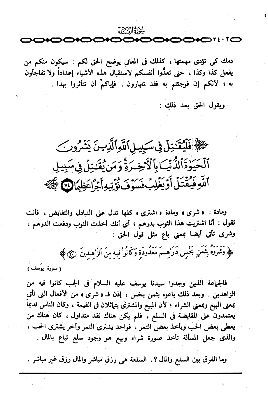 فالجماعة الذين وجدوا سيدنا يوسف عليه السلام في الجب كانوا فيه من الزاهدين. وبعد ذلك باعوه بثمن بخس، إذن ف «شرى» من الأفعال التي تأتي بمعنى البيع وبمعنى الشراء؛ لأن المبيع والمشتري يتماثلان في القيمة، وكان الناس قديماً يعتمدون على المقايضة في السلع، فلم يكن هناك نقد متداول، كان هناك من يعطي بعض الحب ويأخذ بعض التمر، فواحد يشتري التمر وآخر يشتري الحب، والذي جعل المسألة تأخذ صورة شراء وبيع هو وجود سلع تباع بالمال.
