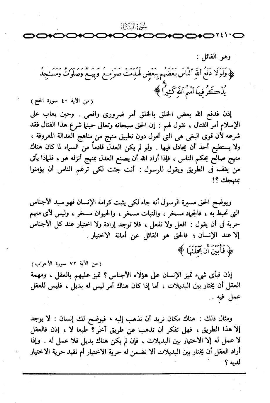 وهو القائل: {وَلَوْلاَ دَفْعُ الله الناس بَعْضَهُمْ بِبَعْضٍ لَّهُدِّمَتْ صَوَامِعُ وَبِيَعٌ وَصَلَوَاتٌ وَمَسَاجِدُ يُذْكَرُ فِيهَا اسم الله كَثِيراً} [الحج: 40] .